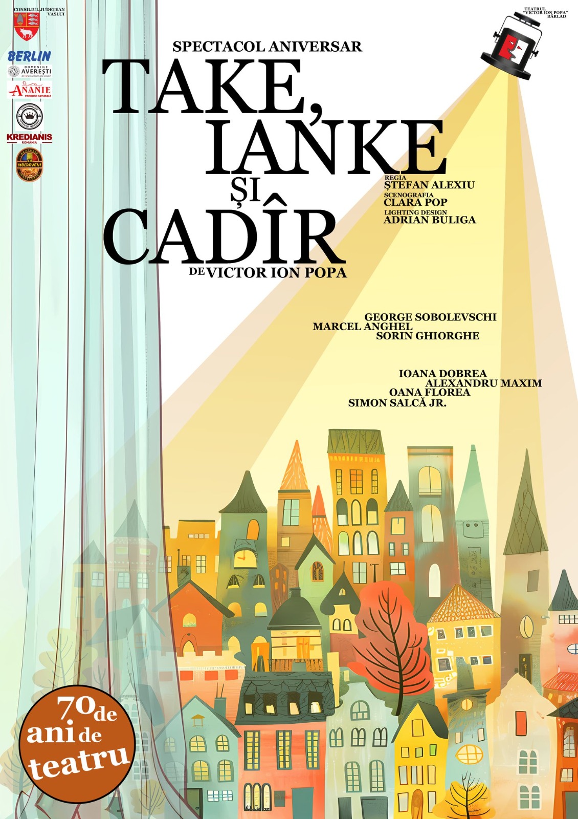 Sâmbãtã pe 15 noiembrie, de la ora 18,30, spectacolul aniversar TAKE, IANKE si CADÂR, de V. I. Popa, revine pe scenã. De ce TAKE, IANKE sI CADÂR? Pentru cã autorul este Victor Ion Popa, pentru cã actiunea se petrece la Podul Pescãriei, pentru cã este o piesã de care ti se face dor si te întorci la ea fascinat de frumusetea replicilor. Cum sã nu-ti doresti sã retrãiesti povestea simplã, plinã de umor si finã ironie, a iubirii dintre doi tineri – unul crestin, altul „ovrei” – ajutati de un turc sã treacã peste prejudecãti si sã se cãsãtoreascã? Dincolo de poveste, textul are un mesaj cald, sentimental, cu umor, scris cu mestesug si plin de replici memorabile. Misterul succesului e simplu: se joacã o piesã în care sentimentele sunt de tolerantã, de prietenie si de iubire, o piesã cu haz, care se bazeazã doar pe cuvânt. Scrisã în 1933, când mediul multietnic era puternic si la Bârlad, piesa impresioneazã prin vivacitatea verbalã a personajelor. Pentru Take si Ianke, vorbãria este un mijloc de alungare, dar si de rezolvare, a grijilor. „Eu, dacã nu vorbesc, mã otrãvesc!” – e replica lui Ianke ce subliniazã faptul cã discursul creeazã lumea; în lipsa lui, devenim strãini si stingheri, îndepãrtati unul de altul…