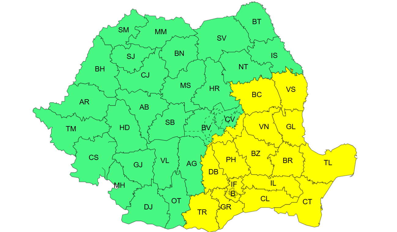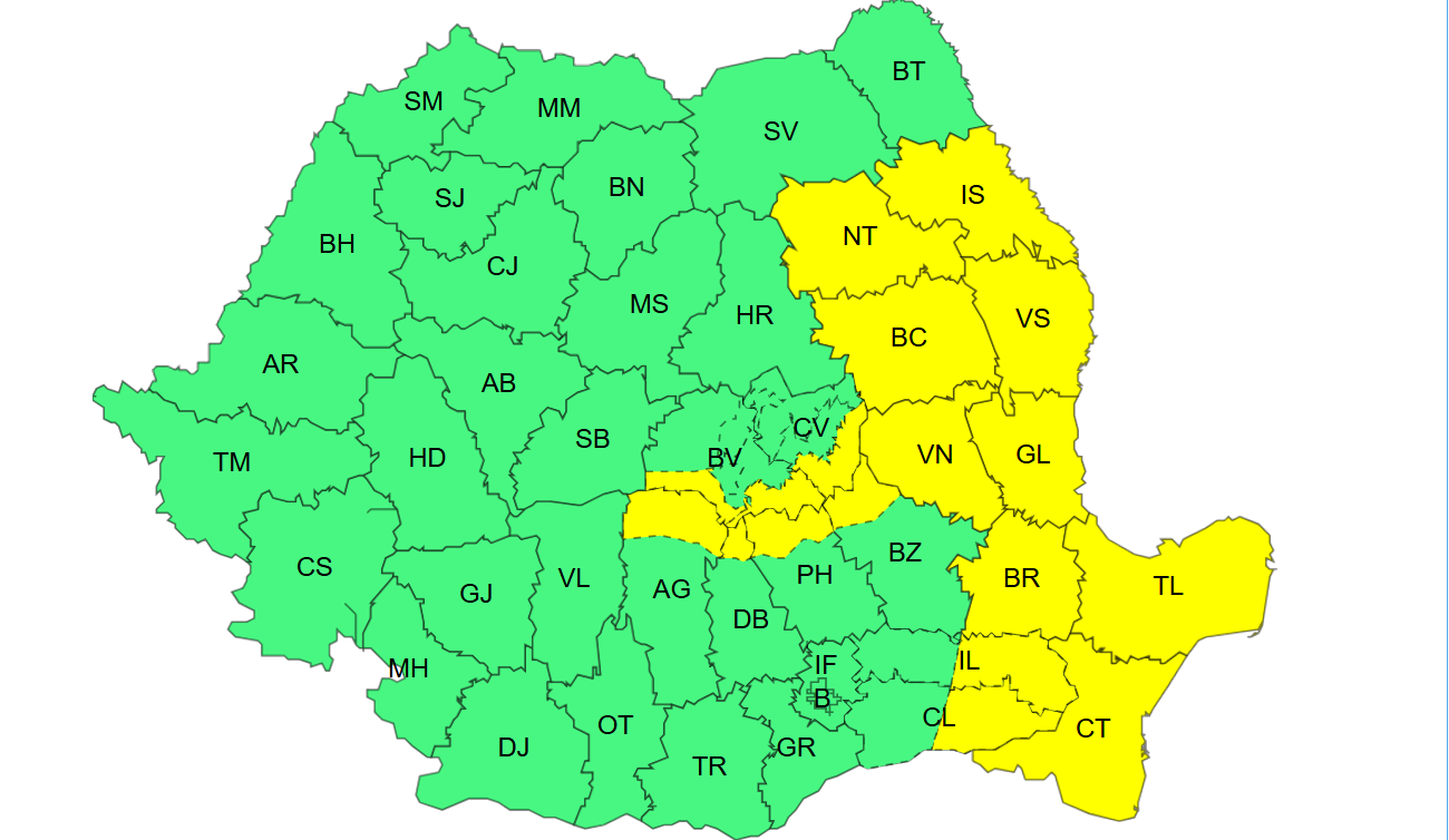 Administraţia Naţională de Meteorologie a emis o atenţionare Cod galben de ploi însemnate cantitativ şi intensificări ale vântului, valabilă marţi, între orele 10.00 şi 21.00, în judeţele Bacău, Vaslui, Vrancea, Galaţi, Buzău, Brăila, Tulcea, Constanţa, Ialomiţa, Giurgiu, Teleorman, Dâmboviţa, Prahova, Ilfov, în municipiul Bucureşti şi parţial în judeţele Braşov şi Covasna.