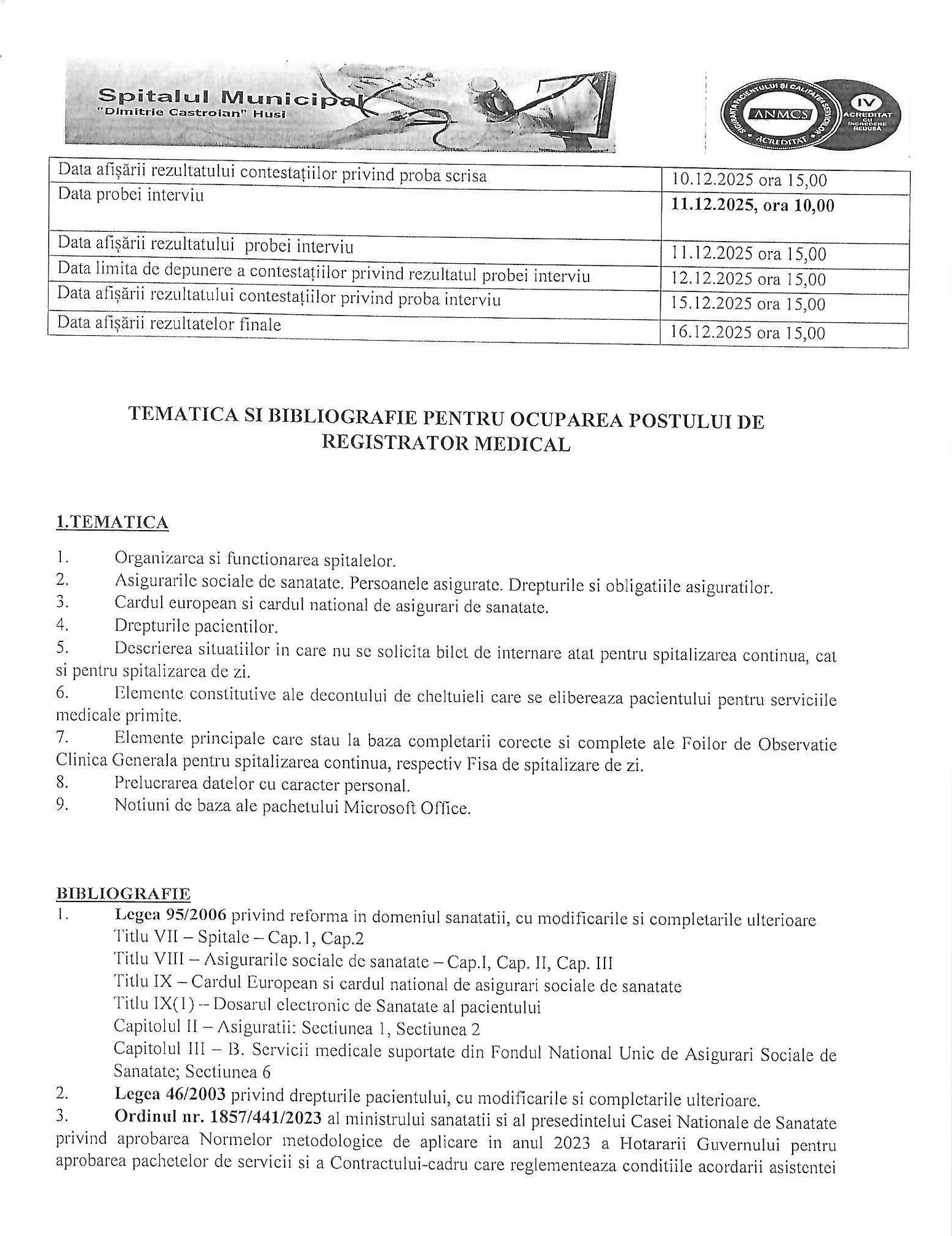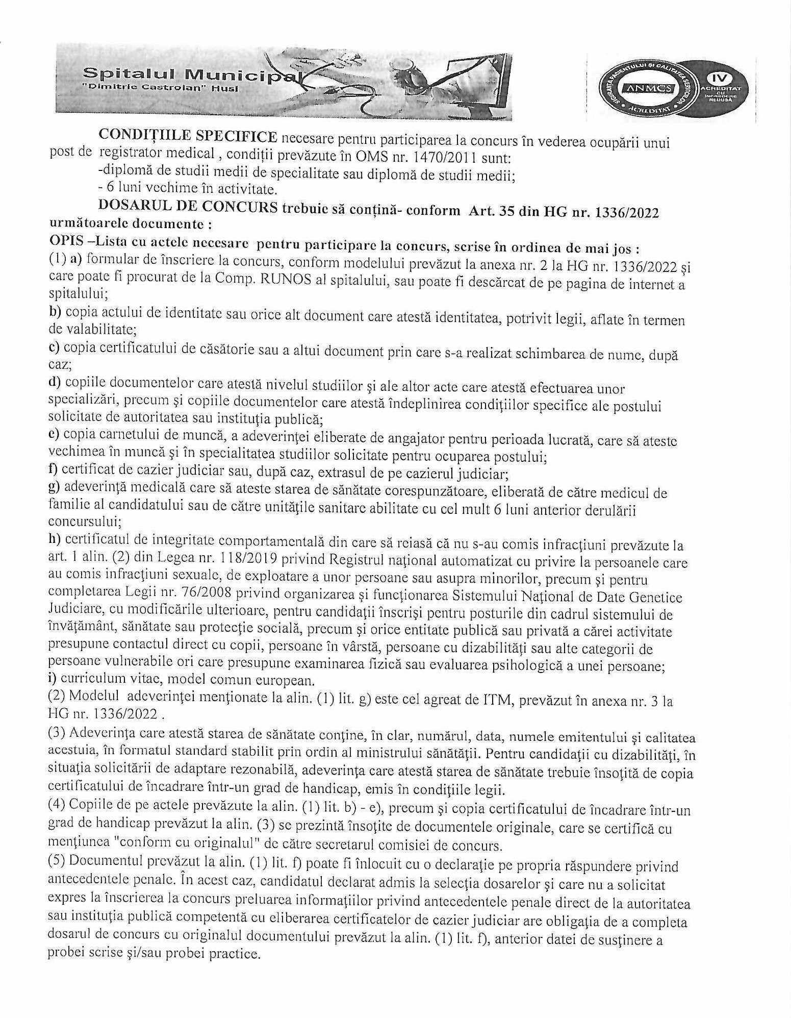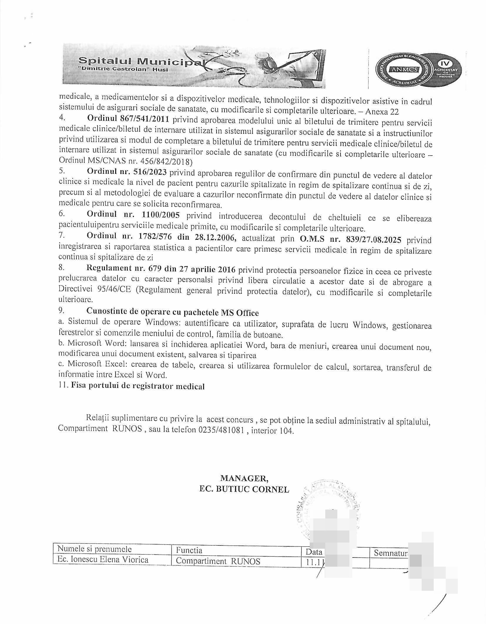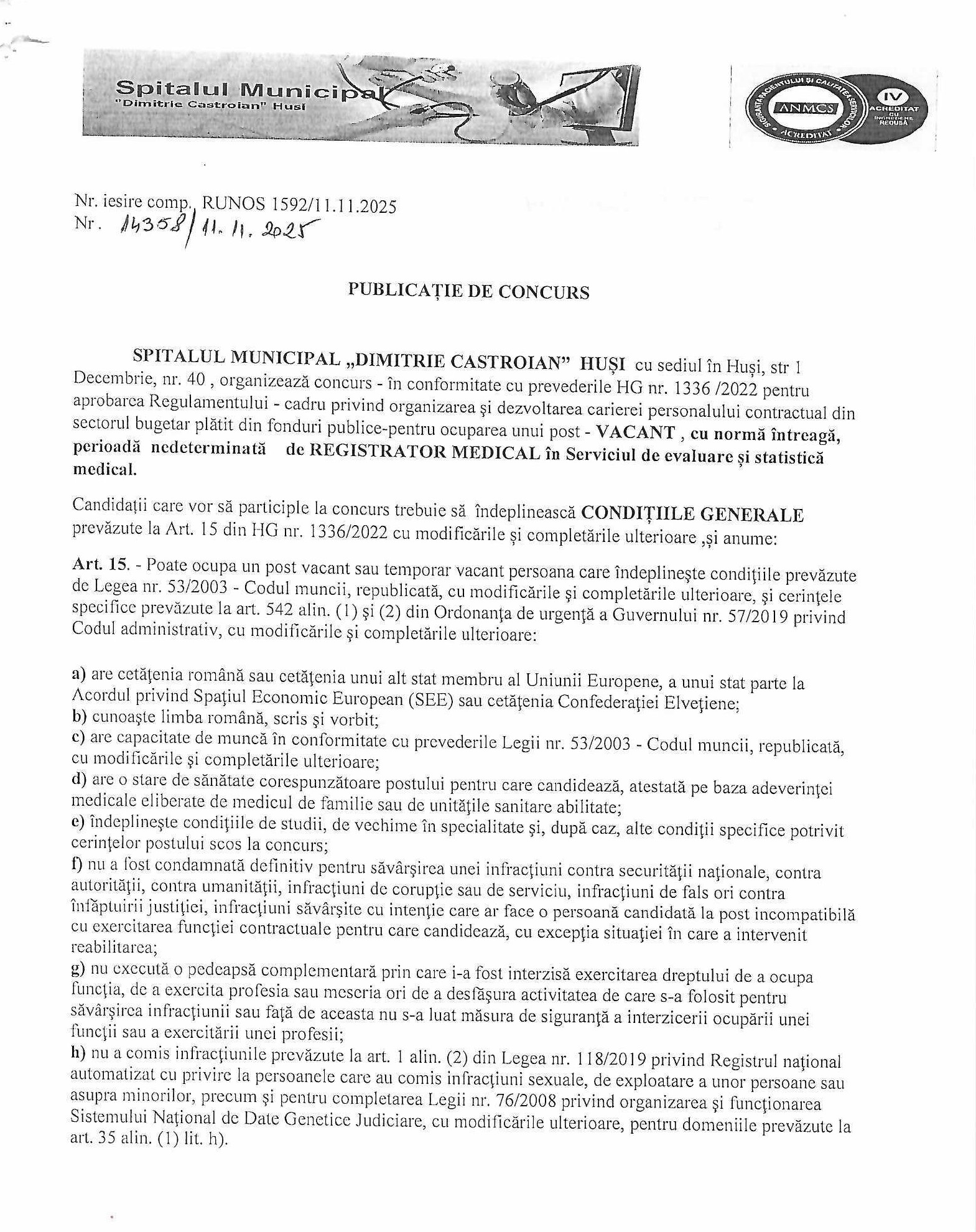 De la nivelul conducerii spitalului municipal „Dimitrie Castroian” Huși, însă, explicații nu s-au dat pentru decizia de anulare a acestui concurs. Managerul ec. Cornel Butiuc a transmis scurt și fără detalii următoarea precizare: „Din motive obiective, se anulează concursul pentru ocuparea postului vacant de registrator medical”. De menționat că persoana care ocupă postul de registrator medical nu ar trebui să fie pusă decât pe bază de competență și seriozitate, întrucât, pentru cei care nu știu, registratorul medical este acel angajat al unui spital care gestionează toate datele personale ale pacienților, cardurile de sănătate, precum și toate celelalte documentele medicale ale acestora. În aceste acte, sunt cele mai intime și personale detalii ale oameni, motiv pentru care recrutarea ar trebui să fie una cu adevărat serioasă.