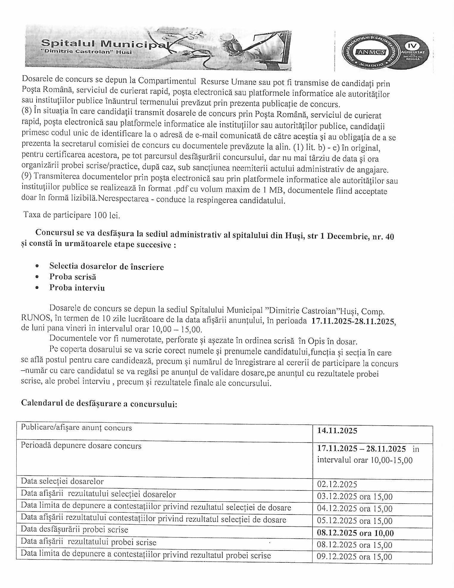 CONTROVERSĂ… Anularea concursului pentru un post în cadrul spitalului municipal „Dimitrie Castroian” Huși, la care ar fi avut șansa să spere chiar și absolvenții de 12 clase, generează iar supărare în rândul localnicilor, mai ales al celor care sunt convinși că pentru a „prinde” un post într-o instituție publică nu se poate decât cu pile. Dăunăzi, conducerea spitalului Huși a anunțat că se organizează concurs pentru ocuparea postului de „registrator medical”, iar condițiile specifice dădeau speranțe multor tineri din Huși. Numai că, după trei zile din perioada de depunere a dosarelor, un anunț sec a precizat oficial că respectivul concurs „s-a anulat”. „Fiica mea are școala postliceală de asistentă medicală terminată, dar nu încăput în spitalul Huși. Acum am vrut să încerce să se angajeze măcar registrator medical, chiar dacă e sub nivelul ei de pregătire. Dar, brusc, concursul se anulează. Ce să înțelegem?”, s-a revoltat în spațiul public mama uneia dintre persoanele care și-au pregătit dosarul pentru concurs.