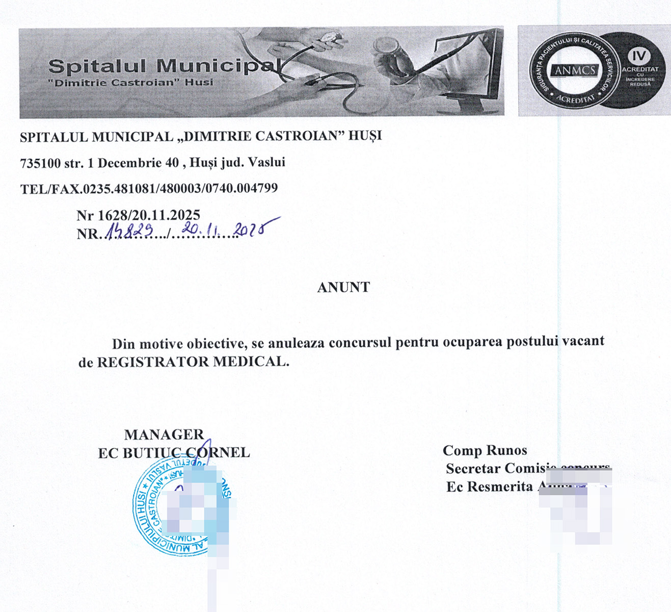 De la nivelul conducerii spitalului municipal „Dimitrie Castroian” Huși, însă, explicații nu s-au dat pentru decizia de anulare a acestui concurs. Managerul ec. Cornel Butiuc a transmis scurt și fără detalii următoarea precizare: „Din motive obiective, se anulează concursul pentru ocuparea postului vacant de registrator medical”. De menționat că persoana care ocupă postul de registrator medical nu ar trebui să fie pusă decât pe bază de competență și seriozitate, întrucât, pentru cei care nu știu, registratorul medical este acel angajat al unui spital care gestionează toate datele personale ale pacienților, cardurile de sănătate, precum și toate celelalte documentele medicale ale acestora. În aceste acte, sunt cele mai intime și personale detalii ale oameni, motiv pentru care recrutarea ar trebui să fie una cu adevărat serioasă.