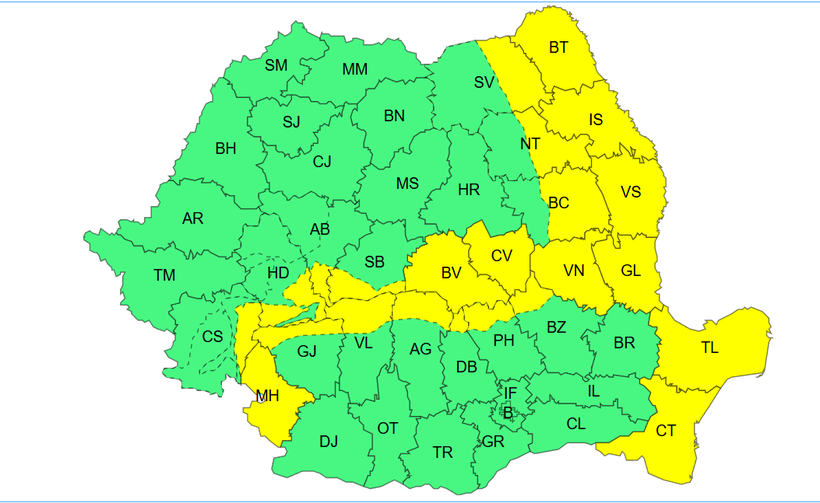 Până la ora 18.00,va fi galben pentru Moldova, Dobrogea, sud-estul Transilvaniei şi vestul Olteniei.