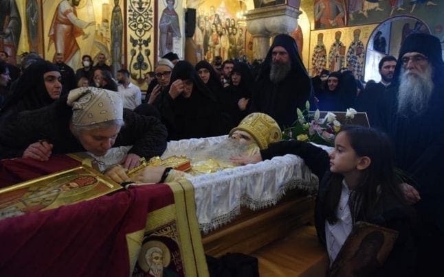 Mii de oameni s-au înghesuit la sicriul mitropolitului din Balcani decedat de COVID-19 şi l-au pupat pe mâini şi pe frunte