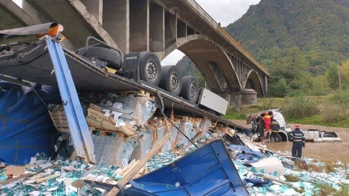 Imagini de coşmar, surprinse marţi, pe Valea Oltului. Un camion plin cu marfă a căzut de la zeci de metri…