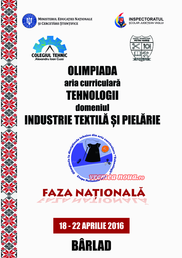 Potrivit informatiilor oferite de inspectorul general al ISJ Vaslui, Gabriela Plãcintã, Mihaela Pãis, directorul Colegiului “Al.I.Cuza” si Otilia Tãnase, directorul Liceului Tehnologic “Petru Rares“ din Bârlad, pentru orasul rulmentilor este o premierã organizarea unei faze nationale a unei olimpiade scolare. Tocmai de aceea, pentru ca totul sã fie la cele mai înalte exigente, organizatorii s-au strãduit din greu sã ofere tot ce este mai deosebit participantilor. În perioada 18 – 21 aprilie, în Sãptãmâna “Scoala Altfel”, sunt asteptati la Bârlad 43 de elevi participanti, din clasele a XI-a si a XII-a din toatã tara, 19 membri ai Comisiei Nationale pentru domeniul Industrie textilã si pielãrie, plus profesorii însotitori. Presedintele comisiei nationale este conf.univ. dr. ing. Ursache Mariana, Facultatea de Textile -Pielãrie si Management Industrial Iasi, presedinte executiv fiind Rodica Ciuchi, din cadrul ISJ Neamt. Olimpiada va avea douã sectiuni: clasa a XI-a – 22 de elevi si clasa a XII-a – 21 de elevi, iar judetul Vaslui este reprezentat de Simona Ionela Burcã (cls. XI-a) si Oana Mãdãlina Dunãreanu (cls. a XII-a), ambele eleve la Colegiul Tehnic “Al.I.Cuza” din Bârlad. Probele scrise se vor da la Colegiul “Al.I.Cuza”, iar proba practicã se va desfãsura la Liceul Tehnologic “Petru Rares“ din Bârlad, în zilele de 19 aprilie (scris) si 21 aprilie (practic). Rezultatele vor fi afisate pe 21 aprilie, dupã-amiazã.