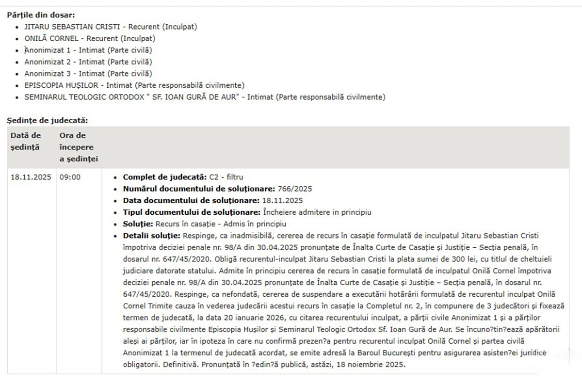 Iată, aceasta este, pe scurt, decizia magistraților ICCJ, în cazul lui Onilă: „Respinge, ca inadmisibilă, cererea de recurs în casație formulată de inculpatul Jitaru Sebastian Cristi împotriva deciziei penale nr. 98/A din 30.04.2025 pronunțate de Înalta Curte de Casație și Justiție – Secția penală, în dosarul nr. 647/45/2020. Obligă recurentul-inculpat Jitaru Sebastian Cristi la plata sumei de 300 lei, cu titlul de cheltuieli judiciare datorate statului. Admite în principiu cererea de recurs în casație formulată de inculpatul Onilă Cornel împotriva deciziei penale nr. 98/A din 30.04.2025 pronunțate de Înalta Curte de Casație și Justiție – Secția penală, în dosarul nr. 647/45/2020. Respinge, ca nefondată, cererea de suspendare a executării hotărârii formulate de recurentul inculpat Onilă Cornel. Trimite cauza în vederea judecării acestui recurs în casație la Completul nr. 2, în compunere de 3 judecători și fixează termen de judecată, la data 20 ianuarie 2026, cu citarea recurentului inculpat, a părții civile Anonimizat 1 și a părților responsabile civilmente Episcopia Hușilor și Seminarul Teologic Ortodox „Sf. Ioan Gură de Aur”. Se încunoștinează apărătorii aleși ai părților, iar în ipoteza în care nu confirmă prezența pentru recurentul inculpat Onilă Cornel și partea civilă Anonimizat 1 la termenul de judecată acordat, se emite adresă la Baroul București pentru asigurarea asistenței juridice obligatorii. Definitivă. Pronunțată în ședință publică, astăzi, 18 noiembrie 2025”, au hotărât judecătorii ICCJ.