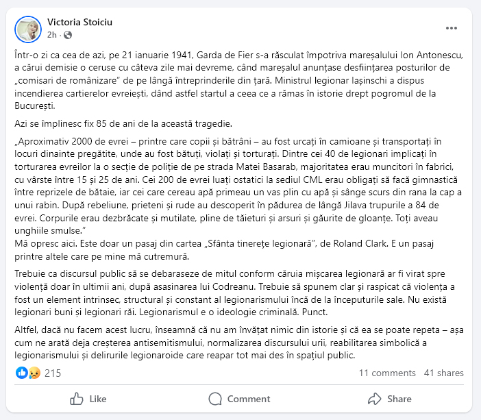 Azi se împlinesc fix 85 de ani de la această tragedie. «Aproximativ 2000 de evrei – printre care copii și bătrâni – au fost urcați în camioane și transportați în locuri dinainte pregătite, unde au fost bătuți, violați și torturați. Dintre cei 40 de legionari implicați în torturarea evreilor la o secție de poliție de pe strada Matei Basarab, majoritatea erau muncitori în fabrici, cu vârste între 15 și 25 de ani. Cei 200 de evrei luați ostatici la sediul CML erau obligați să facă gimnastică între reprizele de bătaie, iar cei care cereau apă primeau un vas plin cu apă și sânge scurs din rana la cap a unui rabin. După rebeliune, prieteni și rude au descoperit în pădurea de lângă Jilava trupurile a 84 de evrei. Corpurile erau dezbrăcate și mutilate, pline de tăieturi și arsuri și găurite de gloanțe. Toți aveau unghiile smulse». Mă opresc aici. Este doar un pasaj din cartea „Sfânta tinerețe legionară”, de Roland Clark. E un pasaj printre altele care pe mine mă cutremură. Trebuie ca discursul public să se debaraseze de mitul conform căruia mișcarea legionară ar fi virat spre violență doar în ultimii ani, după asasinarea lui Codreanu. Trebuie să spunem clar și răspicat că violența a fost un element intrinsec, structural și constant al legionarismului încă de la începuturile sale. Nu există legionari buni și legionari răi. Legionarismul e o ideologie criminală. Punct. Altfel, dacă nu facem acest lucru, înseamnă că nu am învățat nimic din istorie și că ea se poate repeta – așa cum ne arată deja creșterea antisemitismului, normalizarea discursului urii, reabilitarea simbolică a legionarismului și delirurile legionaroide care reapar tot mai des în spațiul public”.
