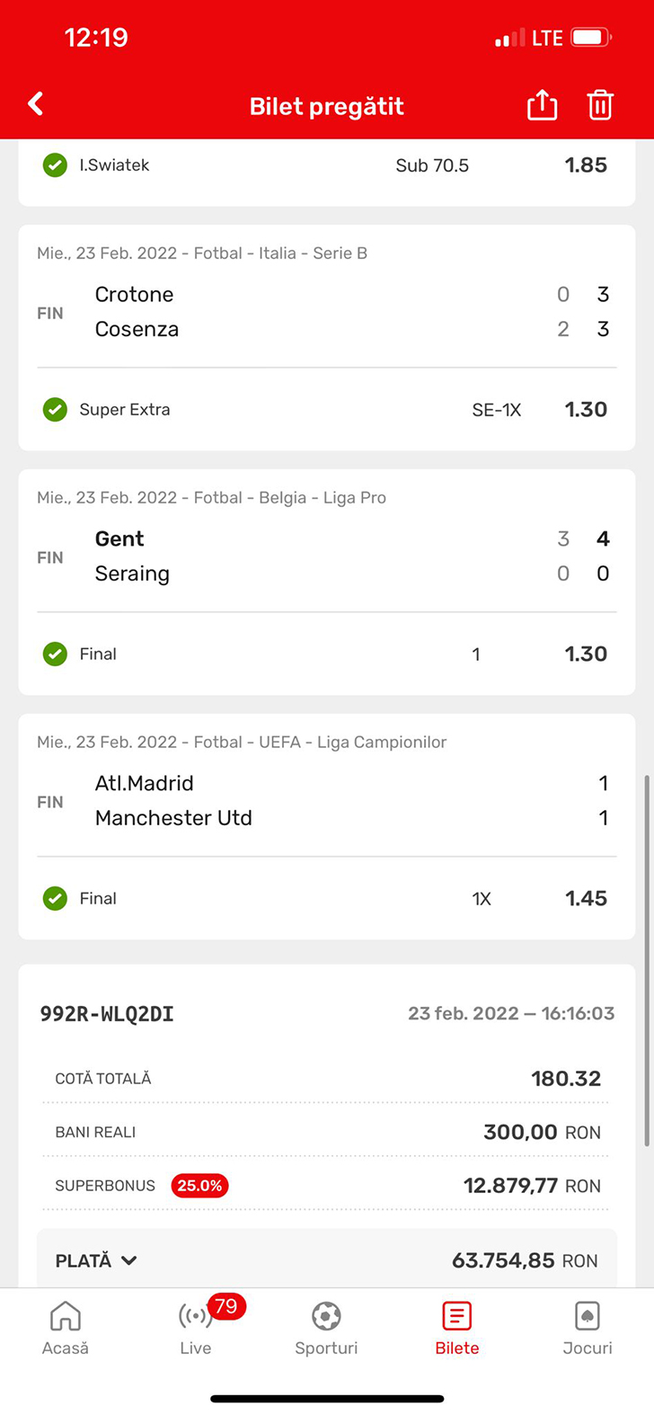Câștig uriaș la pariuri! Un vasluian a pariat 600 de lei și a câștigat peste 25 de mii de euro! Vezi biletul (FOTO)