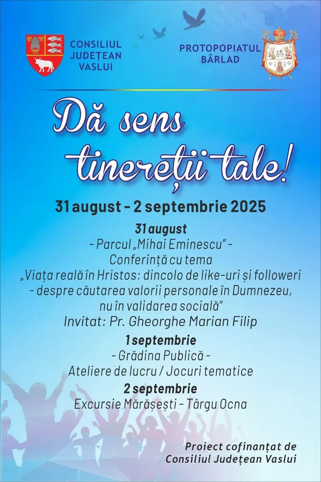 „Cu binecuvântarea Preasfințitului Părinte Ignatie, Episcopul Hușilor, în perioada 31 august – 2 septembrie 2025, Protopopiatul Bârlad implementează proiectul „Dă sens tinereții tale”, cofinanțat de Consiliul Județean Vaslui. Acest demers, adresat în mod special tinerilor, are menirea de a oferi experiențe formative și recreative prin care să descopere valoarea autentică a vieții trăite în comuniune cu Dumnezeu, în Biserică. Duminică, 31 august 2025, ora 17:00, în parcul „Mihai Eminescu” Bârlad. Deschiderea proiectului prin conferința „Viața reală în Hristos: dincolo de like-uri și followeri – despre căutarea valorii personale în Dumnezeu, nu în validarea socială”, susținută de părintele Filip Gheorghe Marian. Luni, 1 septembrie 2025, vor avea loc activități tematice și jocuri de tip team-building, desfășurate în Grădina Publică din Bârlad, menite să dezvolte spiritul de echipă, prietenia și încrederea reciprocă între tineri. Marți, 2 septembrie 2025, va avea loc o excursie de documentare și recreere la Mausoleul de la Mărășești, Salina Târgu Ocna și Izvoarele de la Slănic Moldova – prilej de aprofundare a istoriei și a frumuseții creației lui Dumnezeu. Proiectul reunește 100 de participanți: 80 de tineri din cadrul Protopopiatului Bârlad și 20 de voluntari – tineri și preoți – care îi vor însoți și sprijini în activități. Scopul acestuia este promovarea dezvoltării personale, educaționale și religioase a tinerilor, valorificarea darurilor lor și trezirea conștiinței apartenenței la comunitatea creștin-ortodoxă din care fac parte”, au transmis reprezentanții Episcopiei Hușilor.