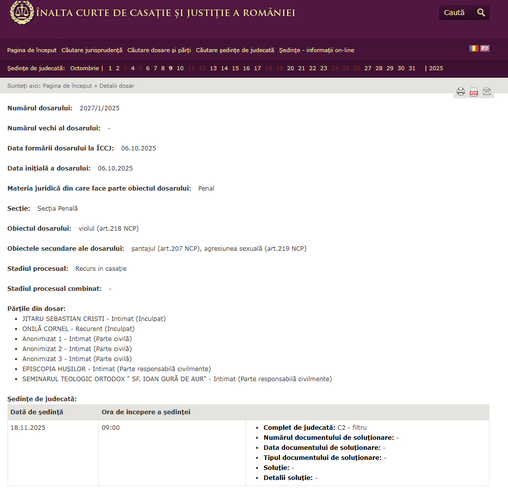 Justitia, însã, are ritmul ei si nu tine seama de drama personalã a fostului episcop de la Husi. Dacã pentru Onilã, condamnat la 8 ani de închisoare pentru „viol în formã continuatã” asupra elevilor de la seminar, instanta de jduecatã se miscã lent, altii cred cã, din contra, a primit termene destul de rapide. Iatã, de pildã, amânarea în cazul „Contestatiei în anulare” a fost amânatã pentru data de 20 noiembrie, cea de-a doua cale extraordinarã de atac si anume „Recursul în casatie” a primit termen pe 18 noiembrie. Avocatii sãi vor sã convingã instanta Înaltei Curti de Casatie si Justitie cã Cornel Onilã a fost condamnat pentru o infractiune pe care n-ar fi sãvârsit-o si anume cea de „viol”. A recunoscut relatiile intime întretinute cu un singur elev, despre care a spus cã ar fi consimtit. Insistã cã cele trei pãrti vãtãmate, mai exact cei trei fosti elevi de seminar, „s-au coalizat acum pentru a-l stoarce de bani”. A dat întreaga vinã pe fostul arhimandrit Sebastian Jitaru si a spus cã acesta a pus la cale totul, ca sã ajungã episcop vicar. A negat cu vehementã autenticitatea imaginilor în care era suprins având relatii intime cu elevii, dând vina pe „Inteligenta Artificialã”. În prezent, vrea sã arate cã nu a fost citat corect, cã nu a putut sã se apere si cã nu i-au fost luate în consideratie probe în favoarea sa. În realitate, însã, dovezile strânse la dosar de procurorii Parchetului de pe lângã Curtea de Apel lasi s-au dovedit imposibil de contracarat. „Fostul episcop a spus cã se roagã si rugãciunile vor face o minune pentru el. El sustine cã nu a fãcut aceste fapte. Îsi face cruce imediat cum cineva aduce vorba de motivul condamnãrii sale. Nu acceptã cã este închis de rând „cu borfasii analfabeti”. Are si zile mai bune, dar are zile când este la pãmânt. Frica si umilinta sunt cele care îl macinã cel mai mult acolo. Si noi ne rugãm, pentru el. I-am spus „Preasfintite, dacã te stii nevinovat, luptã pentru treaba asta”, spun cei care i-au rãmas alãturi.