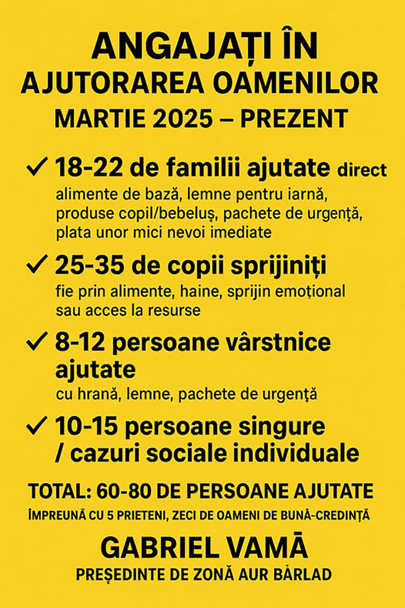 O altă trăsătură definitorie a „președintelui de zonă al AUR” o reprezintă actele de caritate. Conform acestuia, peste 60 de persoane au fost ajutate prin ajutoarele strânse de el: copii, bătrâni etc. Nu există niciun nume și nicio fotografie care să demonstreze asta, dar există o declarație foarte interesantă a unei doamne care i-a donat pentru cauza nobilă și a realizat că a fost înșelată. Este vorba de Elena Mihai care are o mică afacere lângă piața din Bârlad și a fost abordată de Vamă. „Mi-a spus că e consilier local și că ajută oameni necăjiți. I-am dat câțiva saci cu îmbrăcăminte și după aceea i-am spus să-mi trimită și mie poze cu persoanele care au primit acele bunuri. Nu mi-a trimis nimic, m-a blocat și nu mi-a dat înapoi nici sacii pe care îi foloseam la marfă, deși îl rugasem special să-i păstreze pentru că sunt destul de scumpi și folositori”, ne-a declarat Elena Mihai în legătură cu binefăcătorul săracilor, Gabriel Vamă.