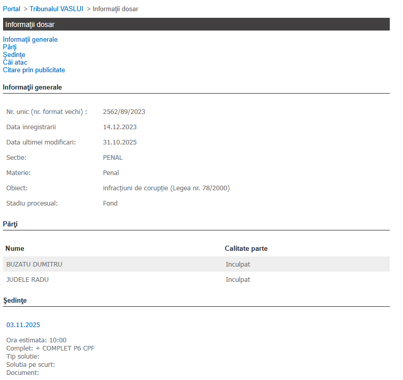 BUIMAC… Înfățișare cu peripeții astăzi, la Tribunalul Vaslui, pentru fostul președinte al Consiliului Județean, Dumitru Buzatu, protagonist într-un amplu dosar de corupție. De la Tribunal i s-ar fi dat telefon inculpatului Buzatu, ca să se verifice dacă acesta se mai prezintă la termen sau, întrucât, ședința începuse la ora 10,00, iar Dumitru Buzatu lipsea. Fostul lider social-democrat, acuzat că a luat mită un portbagaj de bani, se pare că a încurcat orele termenului și, deși credea că ședința de judecată începe la 11,00, de fapt, termenul era fixat cu o oră mai devreme.