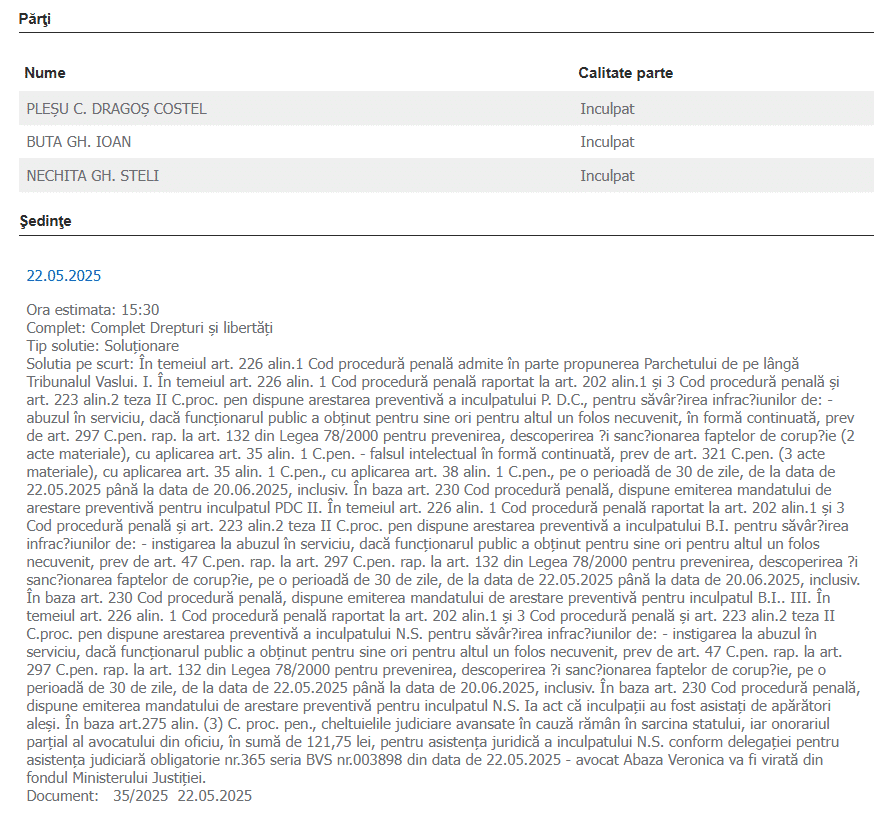Potrivit prim procurorului din cadrul Parchetului de pe lângă Tribunalul Vaslui, polițiștii sunt cercetați sub aspectul săvârășirii infracțiunilor de abuz în serviciu. Iată ce ne-a declarat prim procurorul Ingrid Botezatu: “în data de 21 mai 2025, procurorii din cadrul Parchetului de pe lângă Tribunalul Vaslui a dispus reținerea a patru inculpați într-un dosar în care se efectuează cercetări pentru infracțiuni de corupție, după desfășurarea de activități de urmărire penală, inclusiv percheziții domiciliare, încuviințate de judecătorul de drepturi și libertăți. În fapt, se reține că în ziua de 1 martie 2025, doi agenți de poliție din cadrul Poliției orașului Murgeni, în exercitarea atribuțiilor de serviciu, au încălcat dispozițiile legale de aplicare a sancțiunilor la regimul rutier, cu complicitatea a doi șoferi inculpați în cauză, care au fost de acord cu sancționarea soțiilor lor pentru încălcarea limitei legale de viteză, scop în care au fost întocmite mai multe înscrisuri în fals. În dosar se efectuează cercetări sub aspectul săvârșirii infracțiunilor de abuz în serviciu, dacă funcționarul a obținut pentru sine sau pentru altul un folos necuvenit, fals intelectual, uz de fals, fals material în înscrisuri oficiale, toate infracțiunile fiind săvârșite în formă continuată. Cercetările continuă în acest moment, în vederea stabilirii unei corecte și complete situații de fapt. La acest moment, procurorul a dispus măsura controlului judiciar față de unul dintre inculpați, iar față de ceilalți trei a formulat propunere de arestare preventivă la judecătorul de drepturi și libertăți de la Judecătoria Bârlad”, a declarat Ingrid Botezatu, prim procuror în cadrul Parchetului de pe lângă Tribunalul Vaslui.