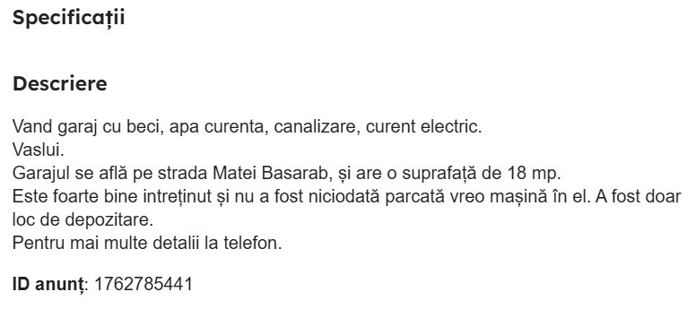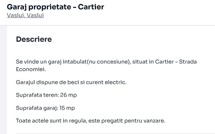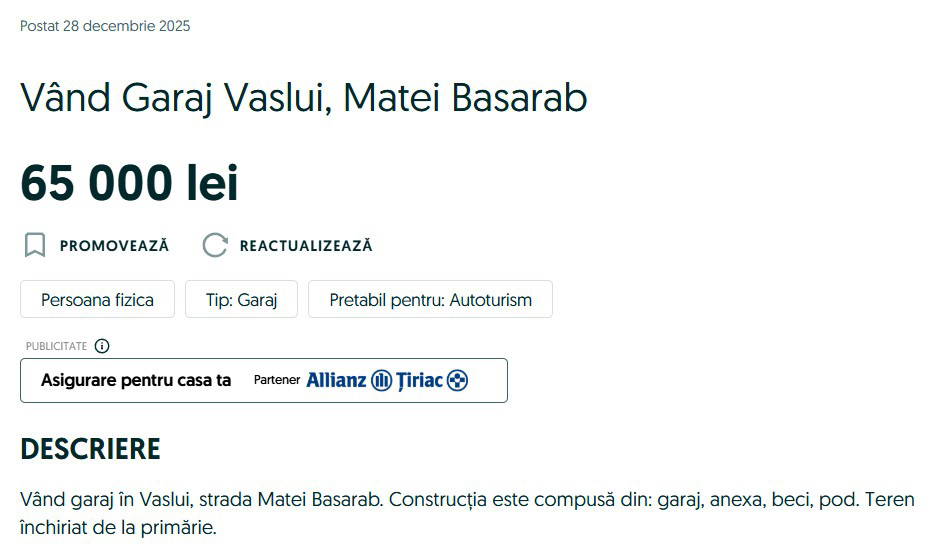 OFERTE… Vasluienii încep să-și scoată la vânzare garajele construite pe terenul primăriei, probabil de teama impozitelor mărite. Mai multe astfel de anunțuri au fost publicate, zilele acestea, pe platformele imobiliare. Două dintre ele se află pe strada Matei Basarab, unul are o suprafață de 34 mp și costă 13.000 euro, iar celălalt – 18 mp și costă 12.000 euro. Proprietarul primului anunț nu a dat prea multe detalii, însă cel al celui de-al doilea anunț, a fost sincer și a recunoscut că respectivul garaj nu a găzduit niciodată vreo mașină, fiind folosit doar ca loc de depozitare. Ba mai mult, din imagini se observă că spațiul este dotat cu chiuvetă și WC, ba chiar și beci. “Vând garaj cu beci, apa curentă, canalizare, curent electric. Vaslui. Garajul se află pe strada Matei Basarab și are o suprafață de 18 mp. Este foarte bine întreținut și nu a fost niciodată parcată vreo mașină în el. A fost doar loc de depozitare”, se arată în anunțul publicat pe platforma imobiliară. Terenul este concesionat de la Consiliul Local, astfel că cei care vor achiziționa aceste garaje vor mai trebui să plătească, pe lângă suma din contractul de vânzare-cumpărare, și o taxă anuală la primărie pentru terenul închiriat. De asemenea, aceștia trebuie să țină cont și de un aspect important: concesiunea se face pe o anumită perioadă de timp și nu este exclus ca, după expirarea perioadei respective, autoritatea publică locală să anunțe că dorește să construiască altceva pe acel teren.