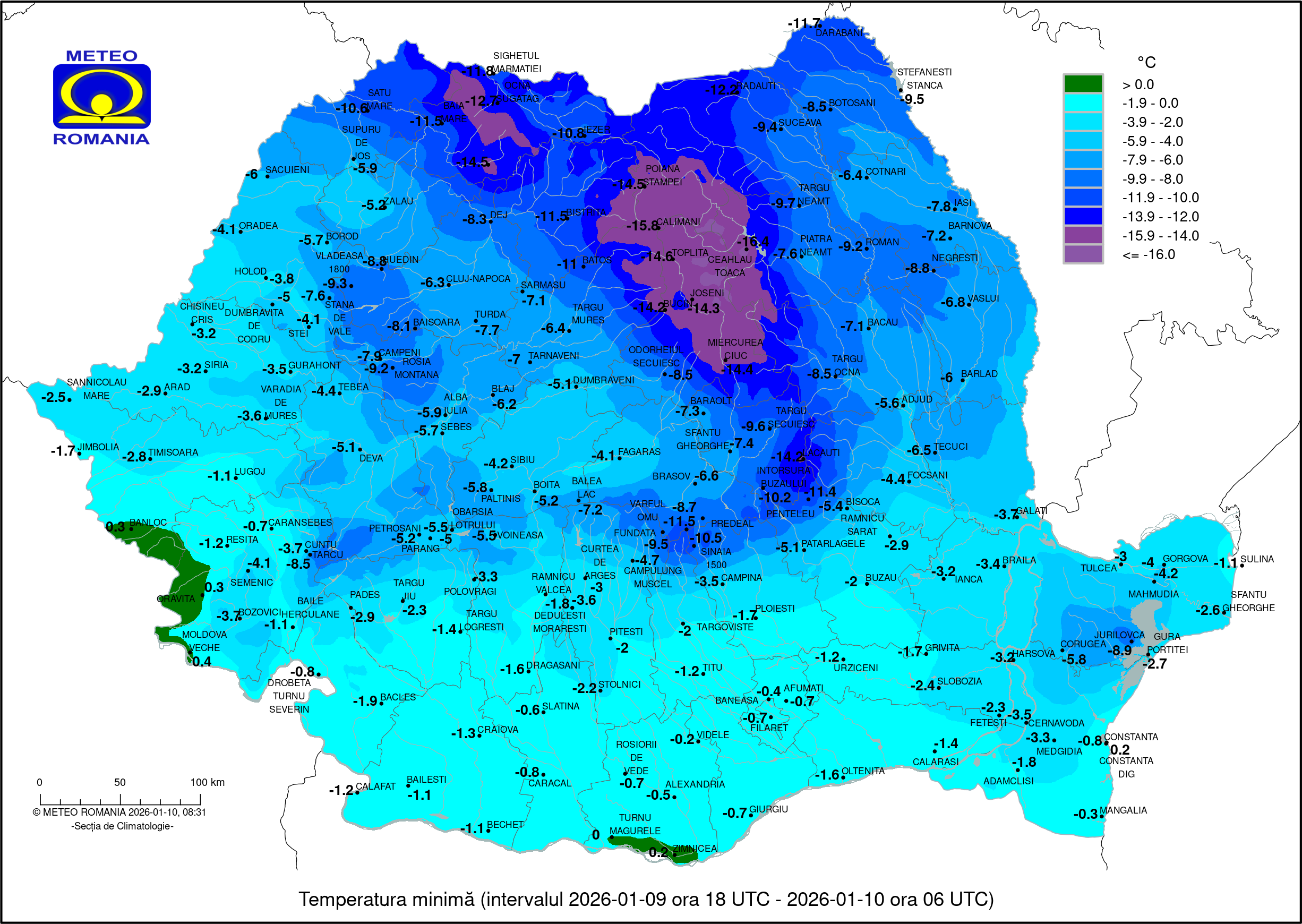 Un val de frig a cuprins nord-estul țării, iar temperaturile au scăzut semnificativ în noaptea și dimineața de astăzi. La Iași s-au înregistrat -8 grade Celsius, în timp ce cea mai scăzută temperatură din țară a fost măsurată pe Ceahlău, unde termometrele au coborât până la -16,4 grade, potrivit datelor furnizate de Administrația Națională de Meteorologie.
