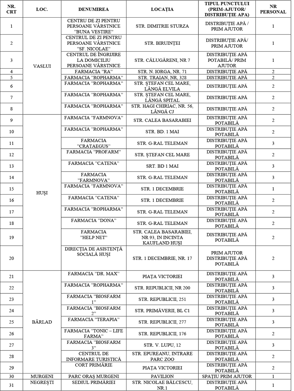 Având în vedere atenționările Ministerului Mediului, Apelor și Pădurilor – Administrația Națională de Meteorologie, privind prognoza indicelui de temperatură – umezeală (ITU) pentru Regiunea Moldova, Direcția de Sănătate Publică Județeană Vaslui transmite prognoza meteorologică pentru intervalul 05.07.2023 – 06.07.2023, disconfort termic ridicat, caniculă (330C – 360C). Totodată, Direcția de Sănătate Publică Județeană Vaslui pune la dispoziția cetățenilor, lista cu punctele de prim ajutor și distribuție a apei potabile din județ: