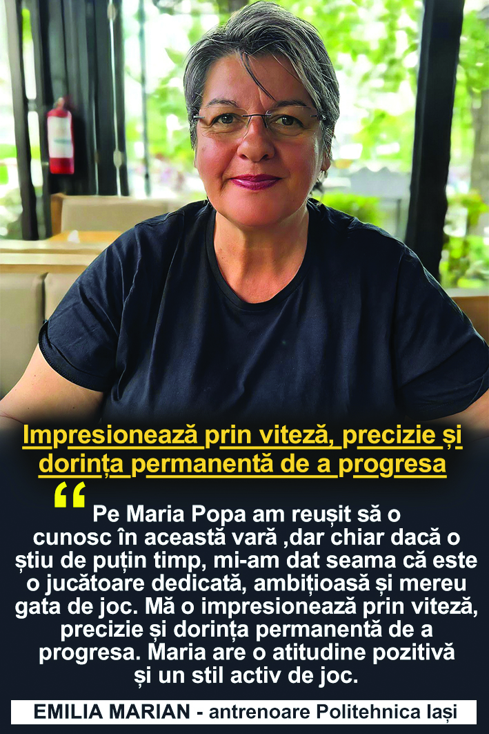 EXEMPLU… Maria Popa este un exemplu perfect, care sustine ideea cã nu toti adolescentii stau cu ochii pe telefoane, fãrã niciun scop în viatã. La doar patru ani, de când a pus mâna prima datã pe o minge de baschet, aceasta evolueazã constant în baschet feminin Campionatul National U17, dar si în Liga 1 de baschet, unde are sansa sã se antreneze si sã joace alãturi de sportive cu experientã, unele chiar de pânã la 38 de ani. „În cazul Mariei, am încurajat si ghidat dezvoltarea ei ca „shooter”, având în vedere capacitatea de a arunca cu precizie de la distantã. Rezultatele nu au întârziat sã aparã. Maria a devenit una dintre cele mai eficiente jucãtoare în aruncãrile de trei puncte din Campionatul Regional si a cîstigat numeroase concursuri de aruncãri de la semi-distantã si distantã”, spune primul antrenor al Mariei, Vlad Sîrbu.