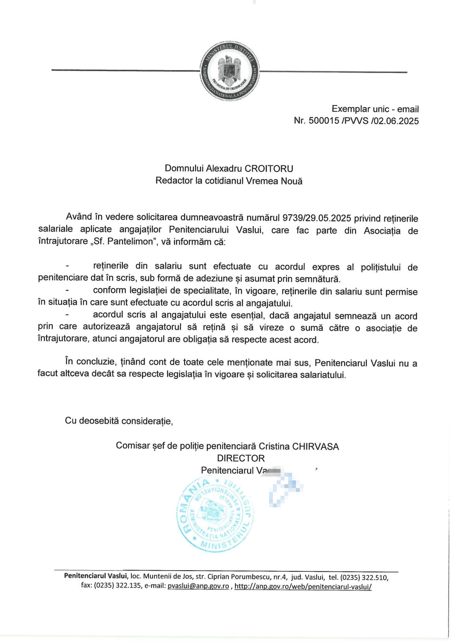 În loc sã lãmureascã întreaga poveste, conducerea Penitenciarului decide sã rãspundã doar la ceea ce îi convine si anume la ce document a stat la baza retinerilor salariale a sumei de 45 de lei, reprezentând cotizatia lunarã cãtre asociatie. Directorul Penitenciarului Vaslui rãspunde, în scris, cã sumele sunt oprite pe statul de platã se face cu acordul expres al politistulului de penitenciar dat în scris, fãrã a preciza dacã acel lucrãtor stia cã banii ajung într-un cont al unei persoane fizice si cã asociatia nu este înregistratã oficial. În rest, preferã sã treacã sub tãcere rãspunsurile la celelate întrebãri pe care le-am prezentat mai sus. „Având în vedere solicitarea dumneavoastrã, numãrul privind retinerile salariale aplicate angajatilor Penitenciarului Vaslui care fac parte din Asociatia de întrajutorare „Sf. Pantelimon”, vã informãm cã: retinerile din salariu sunt efectuate cu acordul expres al politistului de penitenciare dat în scris, sub formã de adeziune si asumat prin semnãturã. Conform legislatiei de specialitate, în vigoare, retinerile din salariu sunt permise în situatia în care sunt efectuate cu acordul scris al angajatului. Acordul scris al angajatului este esential, dacã angajatul semneazã un acord prin care autorizeazã angajatorul sã retinã si sã vireze o sumã cãtre o asociatie de întrajutorare, atunci angajatorul are obligatia sã respecte acest acord. În concluzie, tinând cont de toate cele mentionate mai sus, Penitenciarul Vaslui nu a fãcut altceva decât sa respecte legislatia în vigoare si solicitarea salariatului”, este rãspunsul directoarei, Cristina Chirvasã. Interesant este cã directoarea spune cã respectã legislatia în vigoare cu privire la aceastã asociatie. Nu credem cã este stipulat în vreo lege cã poti retine bani în numele unei asociatii care nu existã si apoi sã-i virez unei persoane fizice. Pot fi chiar acuzatii de coruptie. De unde stim cã aceastã persoanã nu încaseazã sume si de la alte entitãti cu care Penitenciarul Vaslui nu ar trebui sã interactioneze. Este o suspiciune rezonabilã si nu o acuzatie.