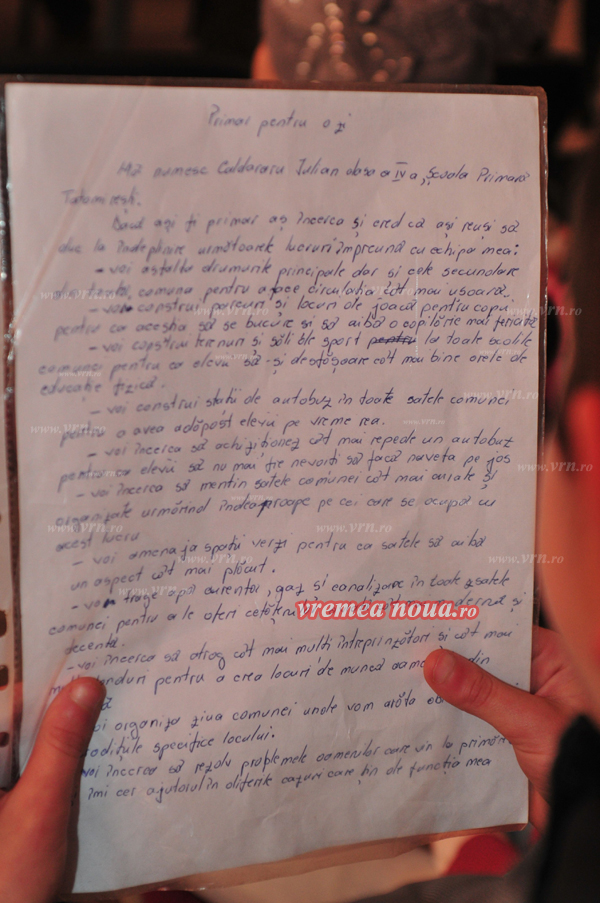 Cei mai buni copii de la scolile componente ale comunei Rebricea s-au întrecut în platforme program, ieri, la clubul elevilor din satul Draxeni. Copiii au pregãtit punctele pe care le-ar dori realizate, în situatia în care ar ajunge primari ai comunei. Cei mai multi au vorbit de reabilitarea scolilor, asiguratul iluminatului electric pentru toate casele din comunã, ajutorarea bãtrânilor, parcuri si locuri de joacã, spatii verzi, drumuri asfaltate sau, în unele cazuri, chiar constructia unui spital pentru copiii cu probleme de vedere. Cea mai bunã lucrare s-a dovedit a fi a lui Vlad Ionut Molan, de la clasele I-IV, cel care a spus cã “un primar trebuie sã fie un om onest, care sã înteleagã problemele cetãtenilor si sã le rezolve problemele cu care se confruntã zi de zi”. Printre obiectivele viitorului “primar” Molan, se numãrã: atragerea de investitii cu fonduri europene, “nicio locuintã fãrã curent electric”, înfiintarea unei microferme a primãriei, la care sã lucreze oamenii din comunã, pietruirea tuturor ulitelor “pentru ca oamenii din comunã sã umble în pantofi si sã nu mai circule în cizme de cauciuc”. “Voi face, dacã voi fi ales primar, ca oamenii din comuna noastrã, pãrintii nostri, sã nu mai plece la muncã în strãinãtate. Sã înfiintãm locuri de muncã aici, agricultura este baza. Mi-as mai dori sã înfiintãm si unul sau douã centre de ajutorare a bãtrânilor”, a mai spus elevul. Pentru toate aceste idei si modul în care si-a expus platforma program, a fost desemnat drept elevul câstigãtor al programului “Primar pentru o zi”. “Mã bucur cã am auzit ce îsi doresc copiii din Rebricea, sunt cel putin zece puncte pe care îmi doresc si eu sã le implementez în activitatea de zi cu zi. Îi voi prezenta lui Ionut care este activitatea de zi cu zi a primarului, iar toti cei 11 copii care au prezentat lucrãri la acest concurs vor face parte din Consiliul Elevilor, din Rebricea. La prima sedintã de CL, în luna ianuarie, îi voi invita pe copii sã vadã cum lucreazã un consiliu local, ei vor fi viitorul acestei comune”, a spus primarul comunei Rebricea, Radu Valericã.