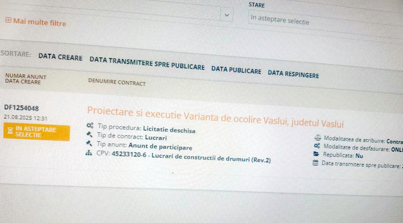 SĂRACI, DAR CU CENTURĂ… Veste mare pentru vasluieni. Compania Națională de Administrare a Infrastructurii Rutiere din România (CNAIR) a scos la licitație pe data de 21 august 2025 proiectarea și execuția Șoselei de Centură a Vasluiului, care va măsura peste 18 kilometri. Aceasta va înconjura practic Vasluiul pe o porțiune de 75%, realizând legături de ocolire a orașului în cele trei direcții, Iași, Bacău și Roman, conducând la îmbunătățirea condițiilor de mediu din zona arterelor urbane pe care se desfășoară traficul de tranzit, prin reducerea noxelor, a zgomotului. Valoarea proiectului este una uriașă, iar CNAIR a scos-o la licitație pentru suma de 864.414.153 lei, adică 132,6 milioane de euro.