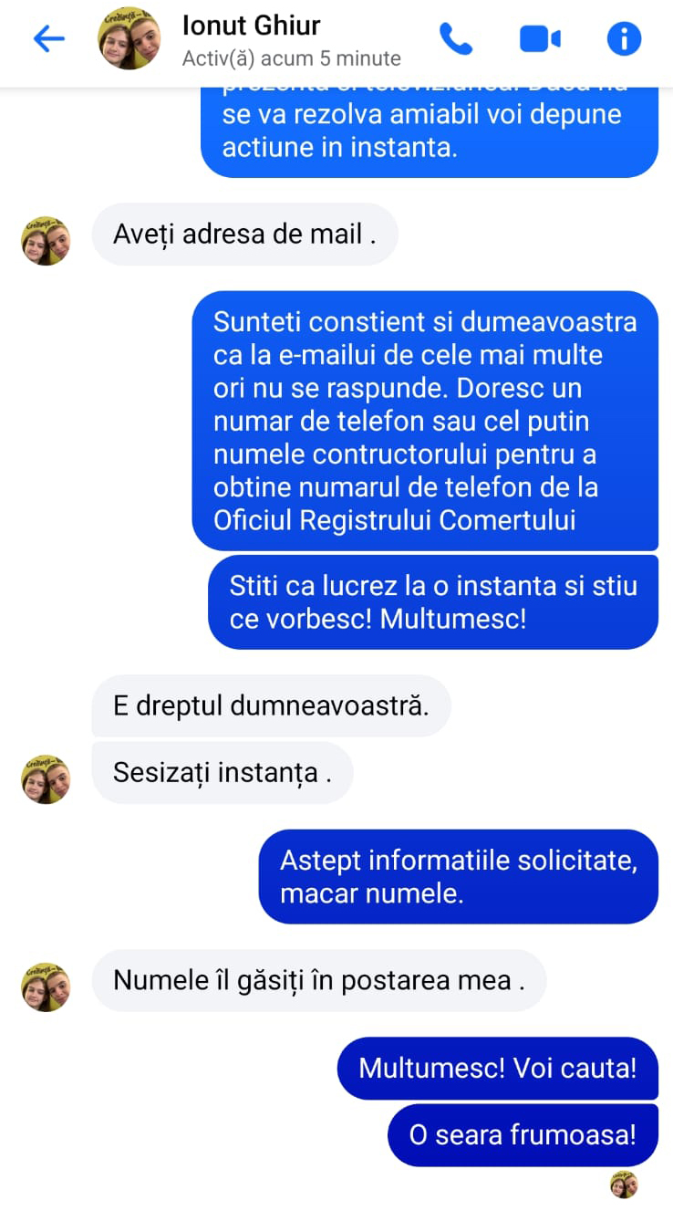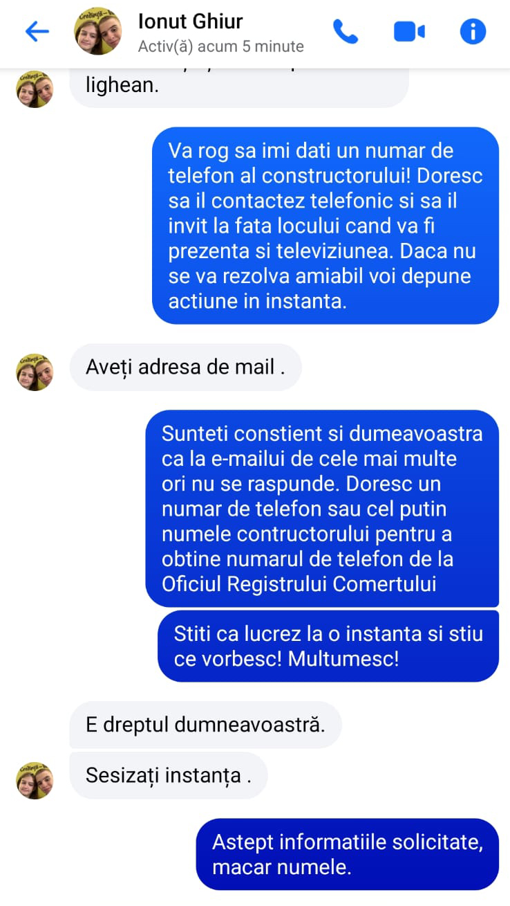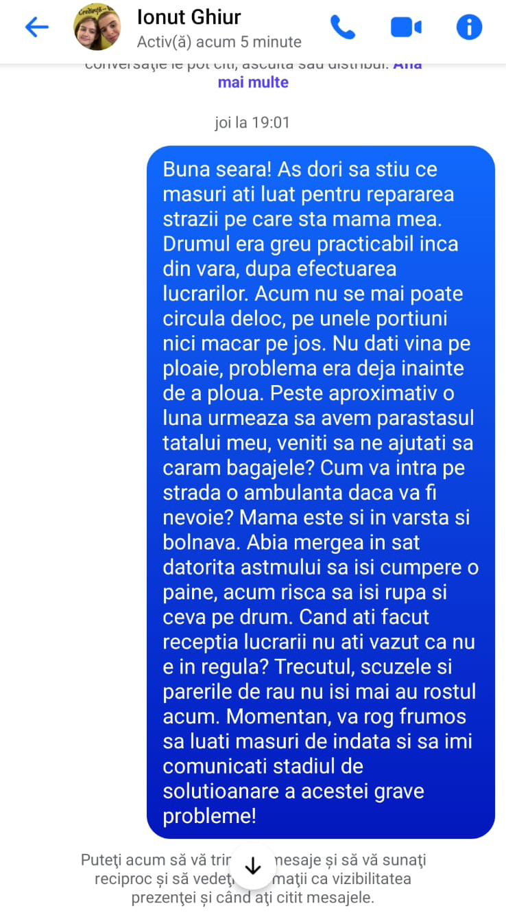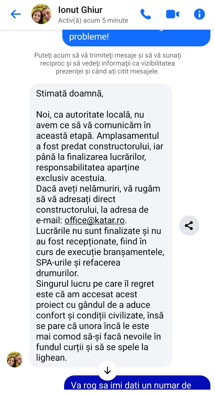PRIMAR FIȚOS… Ținând cont de faptul că primarul unei comunități este un slujbaș al cetățeanului (n.r. cel puțin așa se lăuda edilul) și că nevoile și problemele acestuia trebuie să fie prioritare, mesajul femeii ar fi trebuit să primească un răspuns pe măsură. Numai că Ionuț Ghiur preferă să dea vina pe constructor și să spună că, de fapt, regretă că a accesat un astfel de proiect, fiindcă simte o nemulțumire din partea oamenilor. “Noi, ca autoritate publică, nu avem ce să vă comunicăm în această etapă. Amplasamentul a fost predat constructorului, iar până la finalizarea lucrărilor responsabilitatea aparține exclusiv acestuia. Dacă aveți nelămuriri, vă rog să vă adresați direct constructorului. Lucrările nu au fost finalizate și nu au fost recepționate, fiind în curs de execuție branșamentele, SPA-urile și refacerea drumurilor. Singurul lucru pe care-l regret este că am accesat acest proiect cu gândul de a aduce confort și condiții civilizate, însă se pare că unora le este mai comod să-și facă nevoile în fundul curții și să se spele la lighean”, răspunde primarul Ionuț Ghiur. Văzând mesajul trimis de către edil, Violeta Cleminte spune că își va rezerva dreptul de a acționa în instanță atât pe edil, cât și firma de construcție.