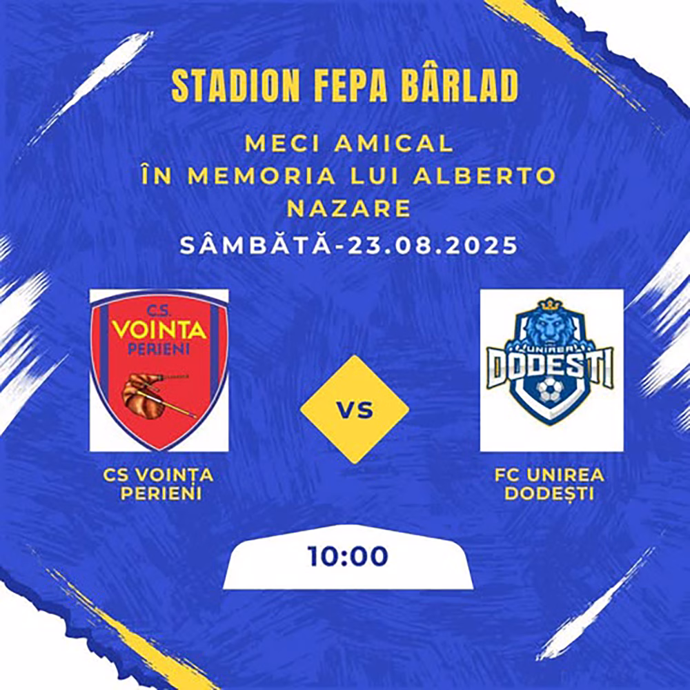 Partida va avea loc sâmbătă, 23 august, la Bârlad, de la ora 10:00, pe stadionul „Municipal”. Înainte de meciul amical, jucătorii celor două echipe vor ține un moment de reculegere în memoria fostului fotbalist. „Sâmbătă, 23.08.2025, la ora 10:00, jucăm un meci amical în memoria colegului nostru Alberto Nazare, care în urmă cu un an ne-a părăsit, trecând la cele sfinte. Meciul va fi organizat în colaborare cu AJF Vaslui și o să jucăm cu CS Voința Perieni, fiind astfel un joc între ultimele două echipe la care acesta a activat ca jucător. Vă invităm să participați la acest meci pe Stadionul FEPA din Bârlad pentru a-l comemora pe Alberto!”, au transmis oficialii clubului Unirea Dodești. Alberto Nazare și-a pierdut viața la vârsta de 26 de ani, în urma unui accident de motocicletă petrecut pe Bulevardul Republicii din Bârlad.