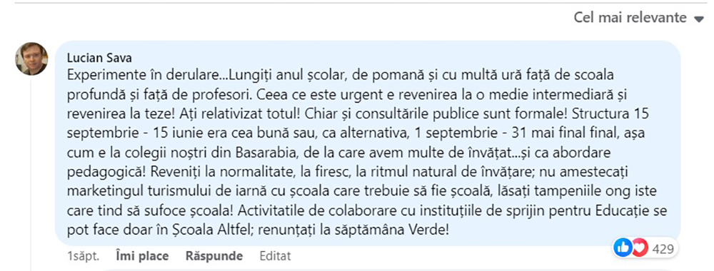 OPINIE… Un cadru didactic din județul Vaslui critică proiectul de calendar al anului școlar 2024-2025. Este vorba despre profesorul Lucian Sava de la Liceul “Mihail Kogălniceanu”, care le cere guvernanților să revină la vechea structură a anului școlar, cea care începea pe 15 septembrie și se încheia pe 15 iunie. De asemenea, acesta este de părere că trebuie să se reia tezele și să se încheie, din nou, medii intermediare (semestriale). “Experimente în derulare… Lungiți anul școlar de pomană și cu multă ură față de școala profundă și față de profesori. Ceea ce este urgent e revenirea la o medie intermediară și revenirea la teze. Ați relativizat totul! Chiar și consultările publice sunt formale. Structura 15 septembrie – 15 iunie era cea bună sau, ca alternativa, 1 septembrie – 31 mai final, așa cum e la colegii noștri din Basarabia, de la care avem multe de învățat… Și ca abordare pedagogică! Reveniți la normalitate, la firesc, la ritmul natural de învățare; nu amestecați marketingul turismului de iarnă cu școala care trebuie să fie școală, lăsați tâmpeniile ONG-iste care tind să sufoce școala! Activitățile de colaborare cu instituțiile de sprijin pentru Educație se pot face doar în Școala Altfel; renunțați la săptămâna Verde”, a scris pe Facebook profesorul Lucian Sava. Opinia dascălului a fost apreciată de peste patru sute de persoane.
