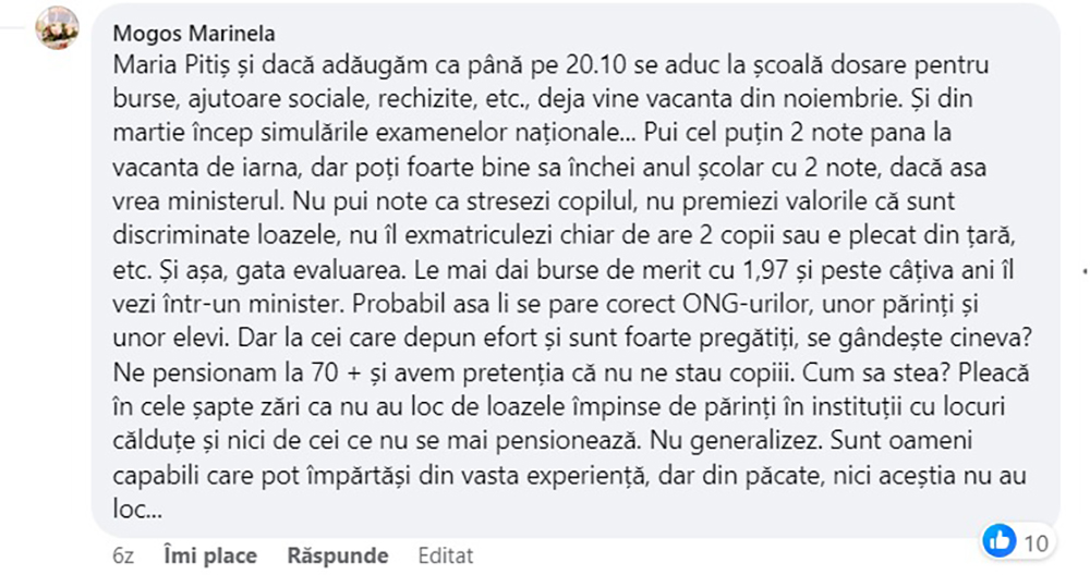 Un alt cadru didactic din Vaslui, însă auxiliar, a criticat, de asemenea, schimbările aduse sistemului de învățământ în ultimii ani: “dacă adăugăm ca până pe 20 octombrie se aduc la școală dosare pentru burse, ajutoare sociale, rechizite etc, deja vine vacanta din noiembrie. Și din martie încep simulările examenelor naționale… Pui cel puțin două note până la vacanța de iarna, dar poți foarte bine să închei anul școlar cu două note, dacă așa vrea ministerul. Nu pui note că stresezi copilul, nu premiezi valorile că sunt discriminate loazele, nu îl exmatriculezi chiar de are doi copii sau e plecat din țară etc. Și așa, gata evaluarea. Le mai dai burse de merit cu 1,97 și peste cîțiva ani îl vezi într-un minister. Probabil așa li se pare corect ONG-urilor, unor părinți și unor elevi. Dar la cei care depun efort și sunt foarte pregătiți, se gândește cineva? Ne pensionăm la 70 și ceva și avem pretenția că nu ne stau copiii. Cum să stea? Pleacă în cele șapte zări că nu au loc de loazele împinse de părinți în instituții cu locuri călduțe și nici de cei ce nu se mai pensionează. Nu generalizez. Sunt oameni capabili care pot împărtăși din vasta experiență, dar, din păcate, nici aceștia nu au loc”, a scris în spațiul public Marinela Mogoș.