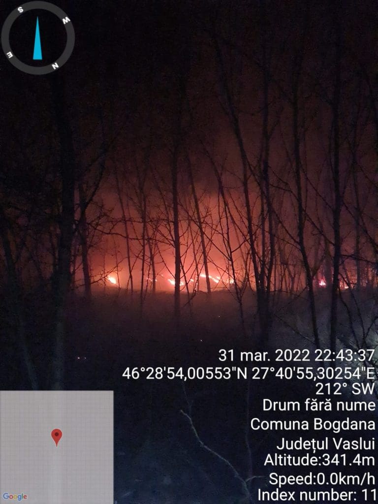 FOC… Pompierii militari din cadrul Detașamentului Bârlad au intervenit, noaptea trecută, cu cinci autospeciale și echipaje specializate pentru limitarea și lichidarea mai multor incendii izbucnite în comuna Bogdănița, în localitățile Cârțibași, Schitu și Coroiești. Inițial, pompierii au fost solicitați să intervină în satul Cârțibași, acolo unde au lucrat pentru stingerea unui focar care a distrus peste trei hectare de vegetație uscată și mărăciniș. La doar câteva minute distanță, pompierii bârlădeni au fost solicitați să intervină în localitatea Schitu, pentru limitarea și lichidarea unui incendiu de vegetație uscată observat foarte târziu. Incendiul din satul Schitu a avut mai multe particularități. Inițial, focul cuprinsese aproximativ un hectar de vegetație uscată, dar nu a fost observat la timp. După întețirea vântului, pe o fâșie de câțiva metri lățime, incendiul s-a propagat spre pădurea tânără care străjuia localitatea. Terenul foarte accidentat și vântul puternic au făcut extrem de dificilă intervenția pompierilor militari și a celor de la SVSU Bogdănița, a localnicilor și a reprezentanților ocolului silvic. După aproximativ șapte ore de muncă asiduă, au fost lichidate și ultimele focare. Au ars aproximativ 20 hectare pădure tânără de salcâm și stejar, fiind salvate alte peste 100 hectare de pădure în parcelele limitrofe. Din cauza temperaturii ridicate, arborii sunt afectați în diferite proporții.