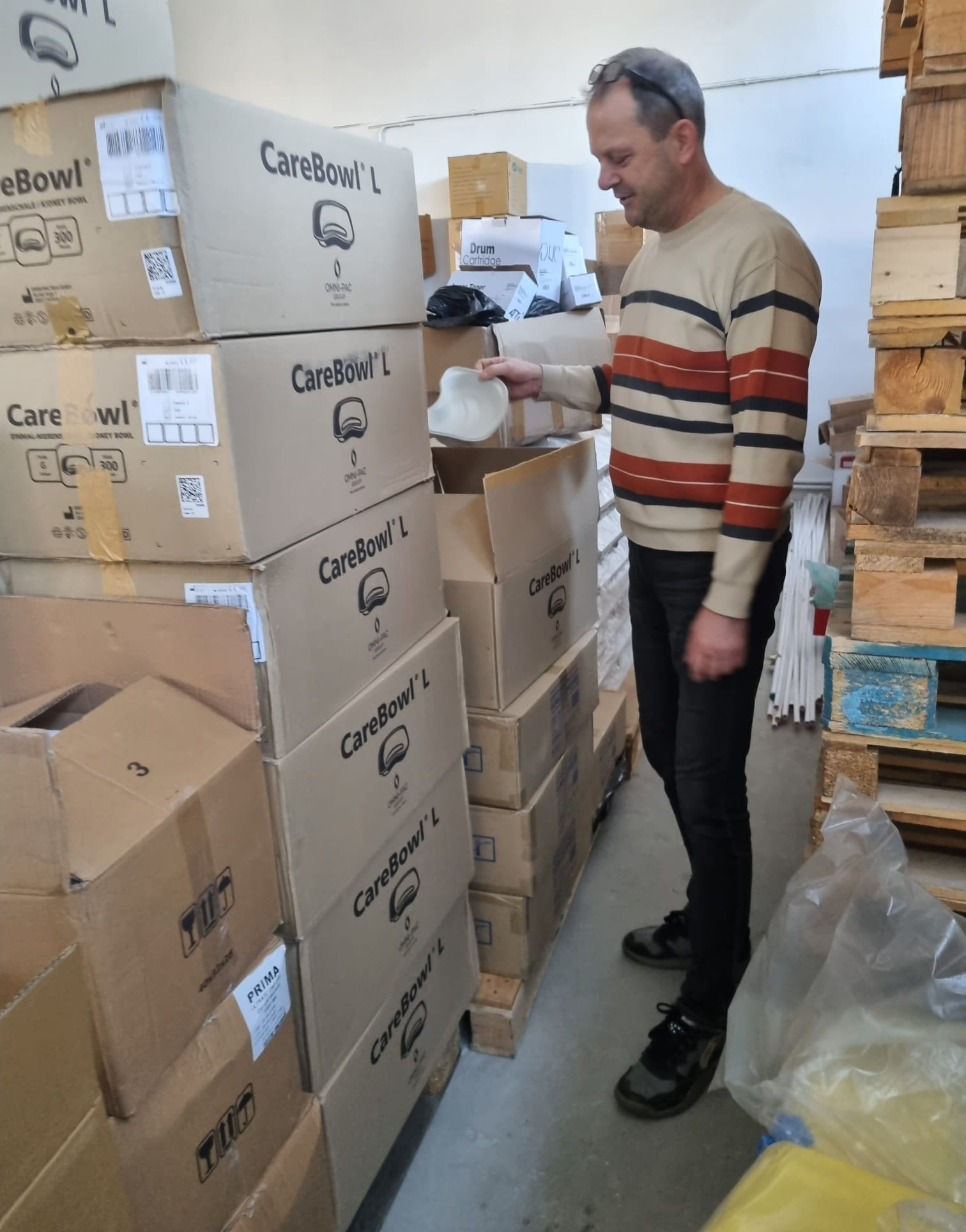 Pentru cei care nu știu, probabil foarte mulți, magazia spitalului din Bârlad se află în spatele bisericii din incintă. Acolo ne aștepta Sorin Olaru, printre o mulțime ordonată de cutii și pachete încă nedesfăcute. „Asta e magazia nouă. Cu totul alte condiții față de ce era înainte la clădirea aia dărăpănată de lângă morgă! Fără apă curentă, căldură la sobă. Acum e cu totul altceva aici. Totul e informatizat”, ne arată Sorin inclusiv biroul său dotat cu un PC nou. Are 57, dar nu se vede vârsta: „Nu prea mă gândesc la pensionare, pentru că la cum se prelungește vârsta la noi în țară, se pare că voi mai petrece mult timp pe aici”. Se plimbă printre rafturi, arătând ultimele produse venite, pijamale de unică folosință. „La UPU se folosesc acum atât pijamale, cât și așternuturi de unică folosință. Pe celelalte secții au rămas cele normale, care se spală la spălătorie”, ne explică acesta.