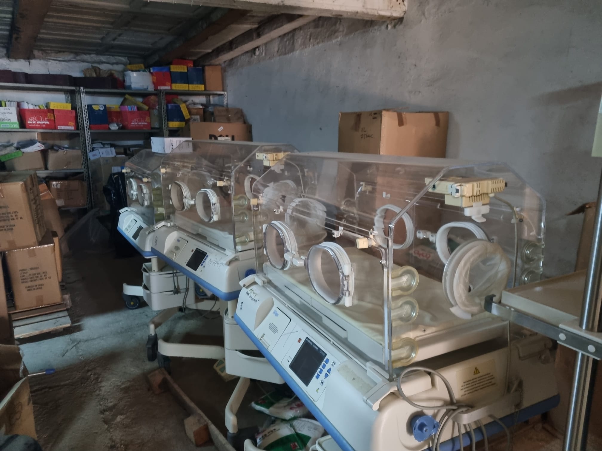 După prezentarea în amănunt a magaziei noi, mergem și la „vechituri”, fosta magazie unde sunt ținute obiectele mai puțin importante. Traversăm întreaga curte a spitalului până la clădirea veche, acolo unde Sorin scoate cheile și se luptă puțin cu încuietoarea veche. Înăuntru, par fi exponate dintr-un muzeu uitat, cu câteva calculatoare de primă generație și niște copiatoare XEROX cât un frigider, alături de alte obiecte mai puțin definite. „Aici era biroul meu, făceam focul la sobă, dar în rest șuiera vântul. Acum, ținem aici instrumentarul care urmează să fie casat. Sunt vechi și depășite, nu se mai folosesc. Mai am niște ochelari de protecție, niște combinezoane și niște măști din perioada Covid, dar măștile se mai folosesc și acum. Astea sunt niște incubatoare vechi. Au fost schimbate și au ajuns aici”, ne-a explicat Sorin.