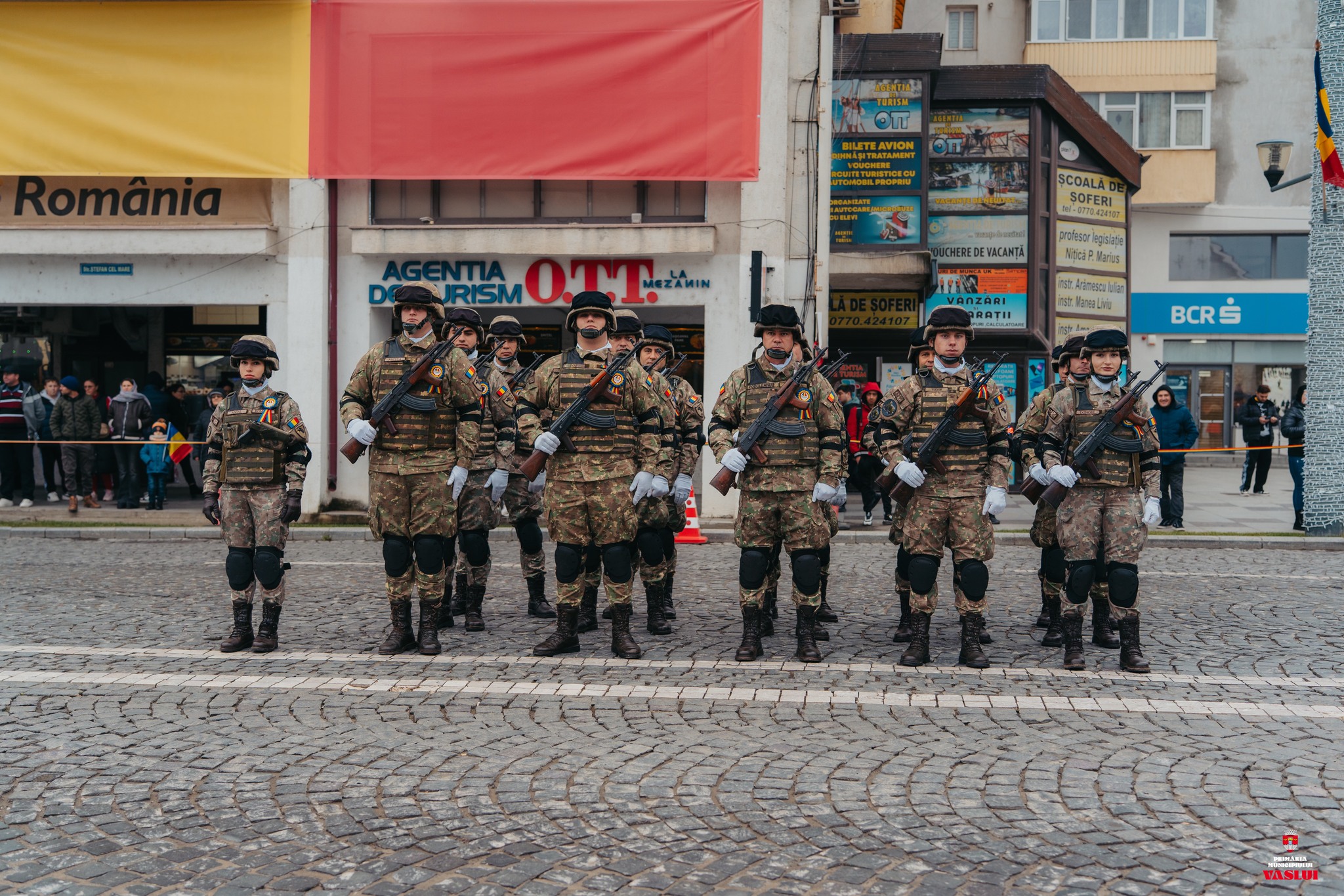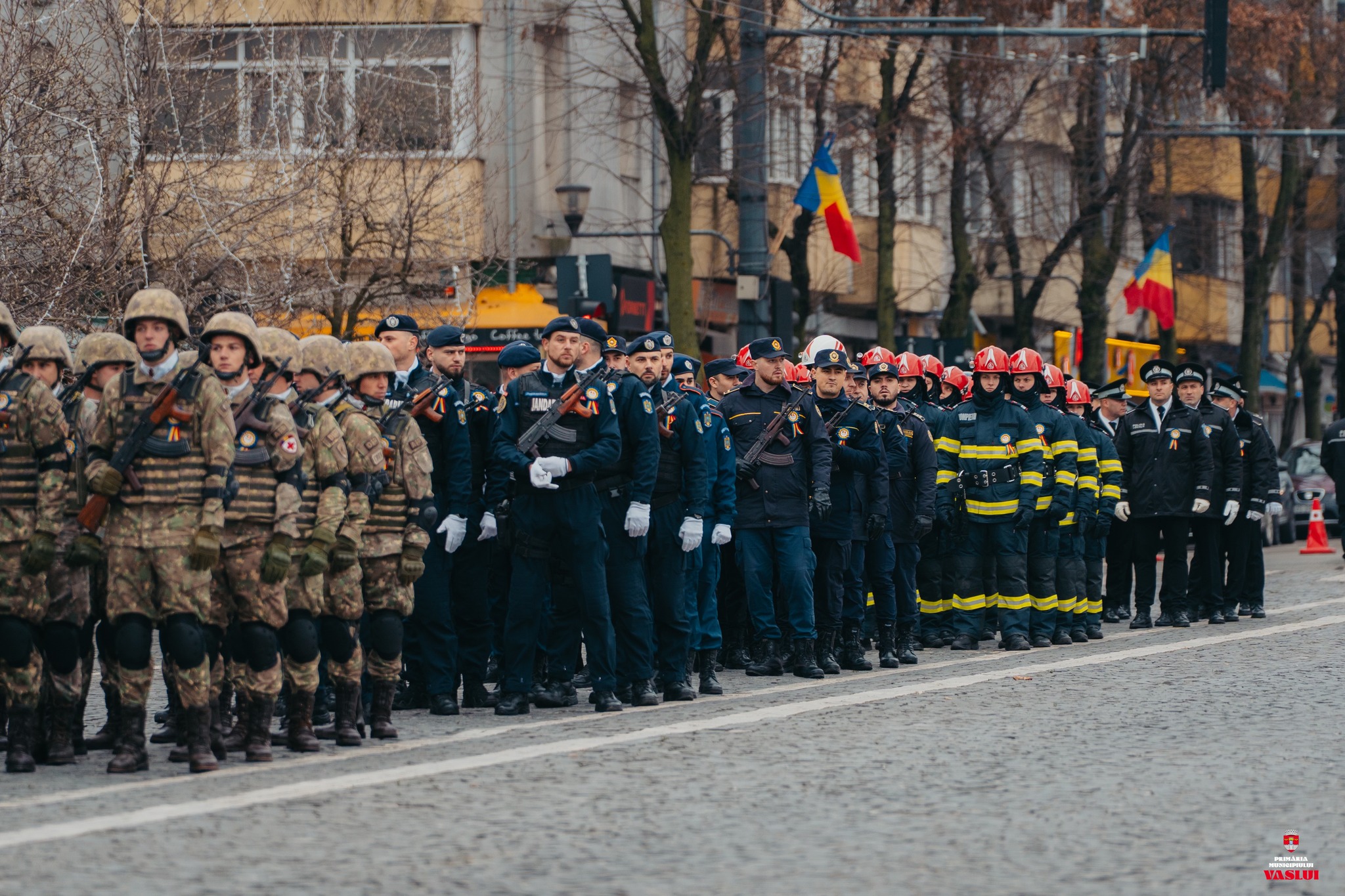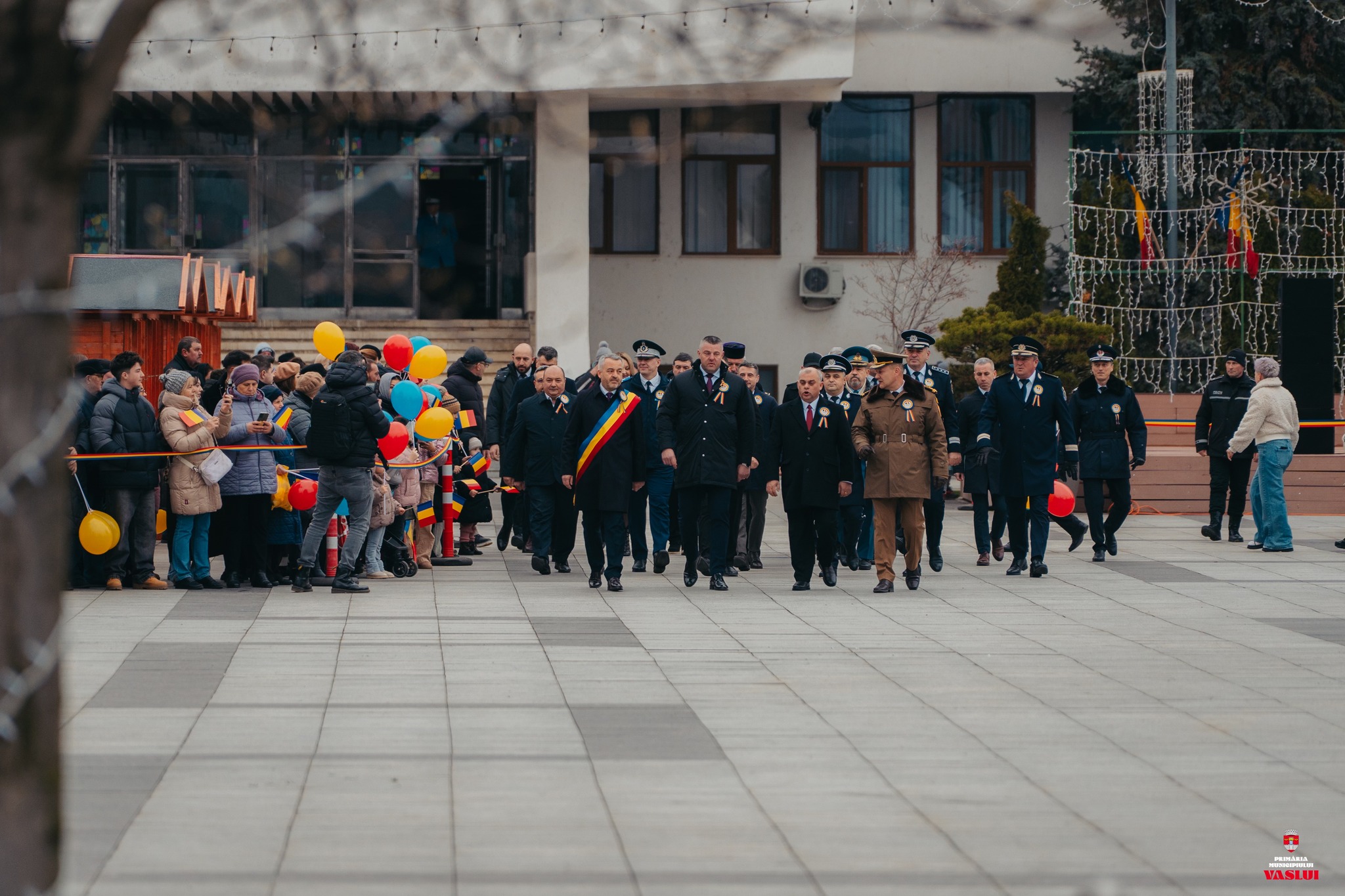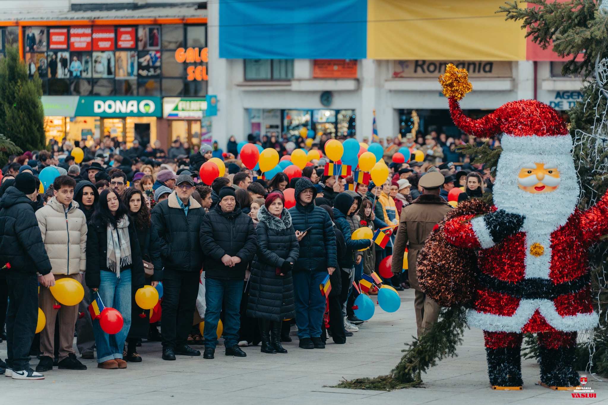 Vremea mai bună decât zilele trecute, văduvită totuși de prezența soarelui, a încurajat vasluienii ca după prânzul în familie să se îndrepte către Piața Civică din centrul orașului. Adunată să vadă parada militară, mulțimea s-a întins de-a lungul bulevardului {tefan cel Mare, din colțul Casei de Cultură până aproape de fosta clădire a BCR. Pe lângă entuziasmul și nerăbdarea celor mici și-a făcut apariția și puțină dezamăgire când mulțimea a realizat că parada va fi lipsită de tehnică militară. Mulți părinți au declarat că această tehnică a fost motivul cu care au reușit să-i scoată pe cei mici din case, însă situația s-a remediat puțin mai târziu, când s-a aprins iluminatul festiv de sărbători. Printre oficialitățile care au participat la eveniment s-au numărat, primarul Lucian Braniște, președintele Consiliului Județean, Ciprian Trifan, parlamentari de Vaslui, fețe bisericești, precum și prefectul de Vaslui, Eduard Popica. Reprezentantul guvernului în teritoriu a dat citire mesajului de unitate al premierului Ilie Bolojan cu referire la importanța zilei de 1 Decembrie. Din păcate, nici defilarea cu torțe a polițiștilor locali nu s-a ridicat la înălțimea așteptărilor, torțele respective aducând mai degrabă cu niște lumânări.