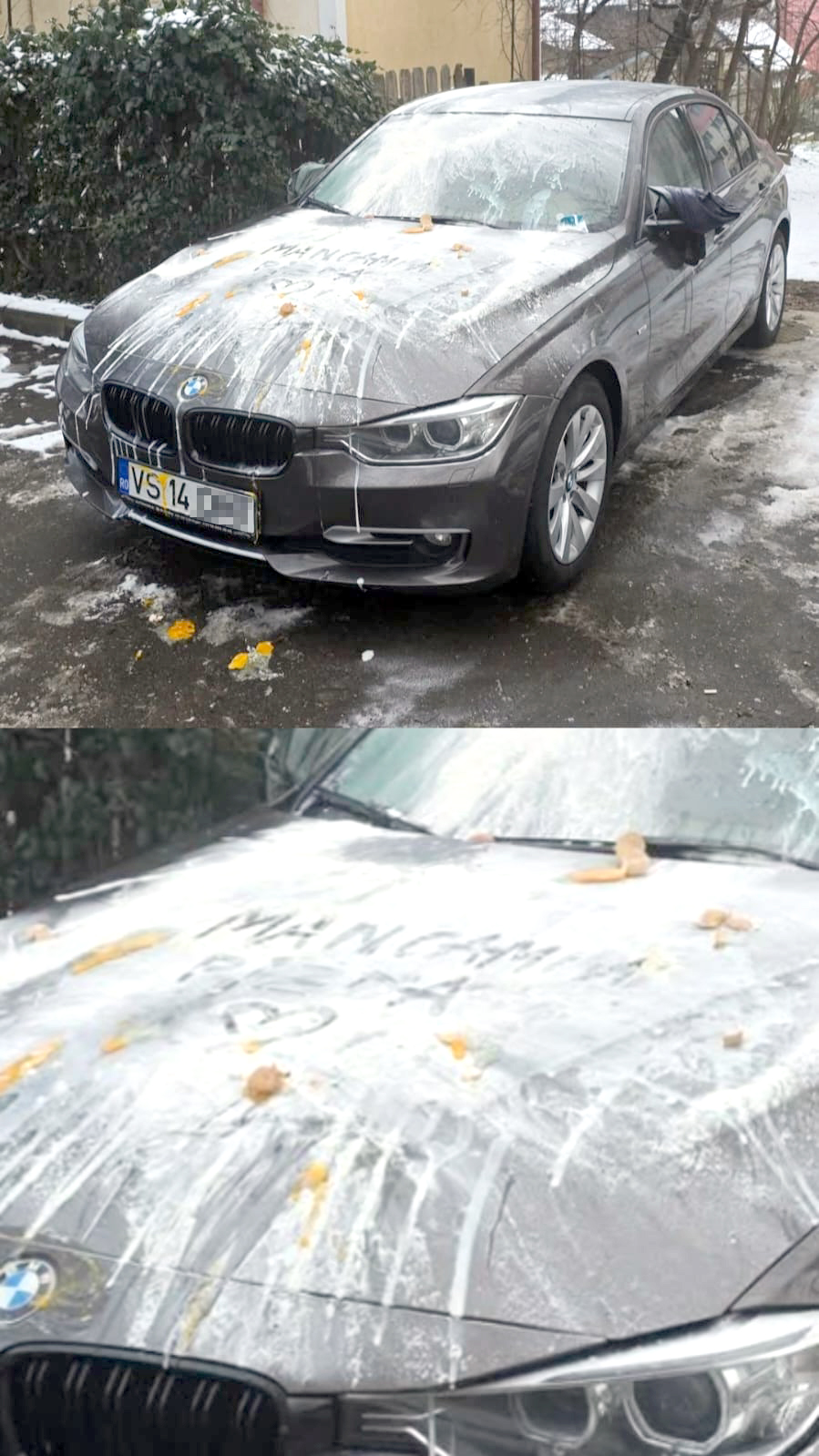 La Iasi, un vasluian care probabil a parcat unde nu trebuie s-a ales cu înjurãturi, dar si cu masina vandalizatã cu ouã si fãinã. Parcã îti este milã când vezi bolidul de lux decorat parcã de-o gospodinã supãratã cã nu i-a iesit cozonacul. Mesajul este unul mai colorat si nu ne permitem sã-l redãm aici, dar totusi, gopodina noastrã îi transmite la final un mesaj de iubire, desenându-i pe masinã soferului neinspirat si o inimioarã.