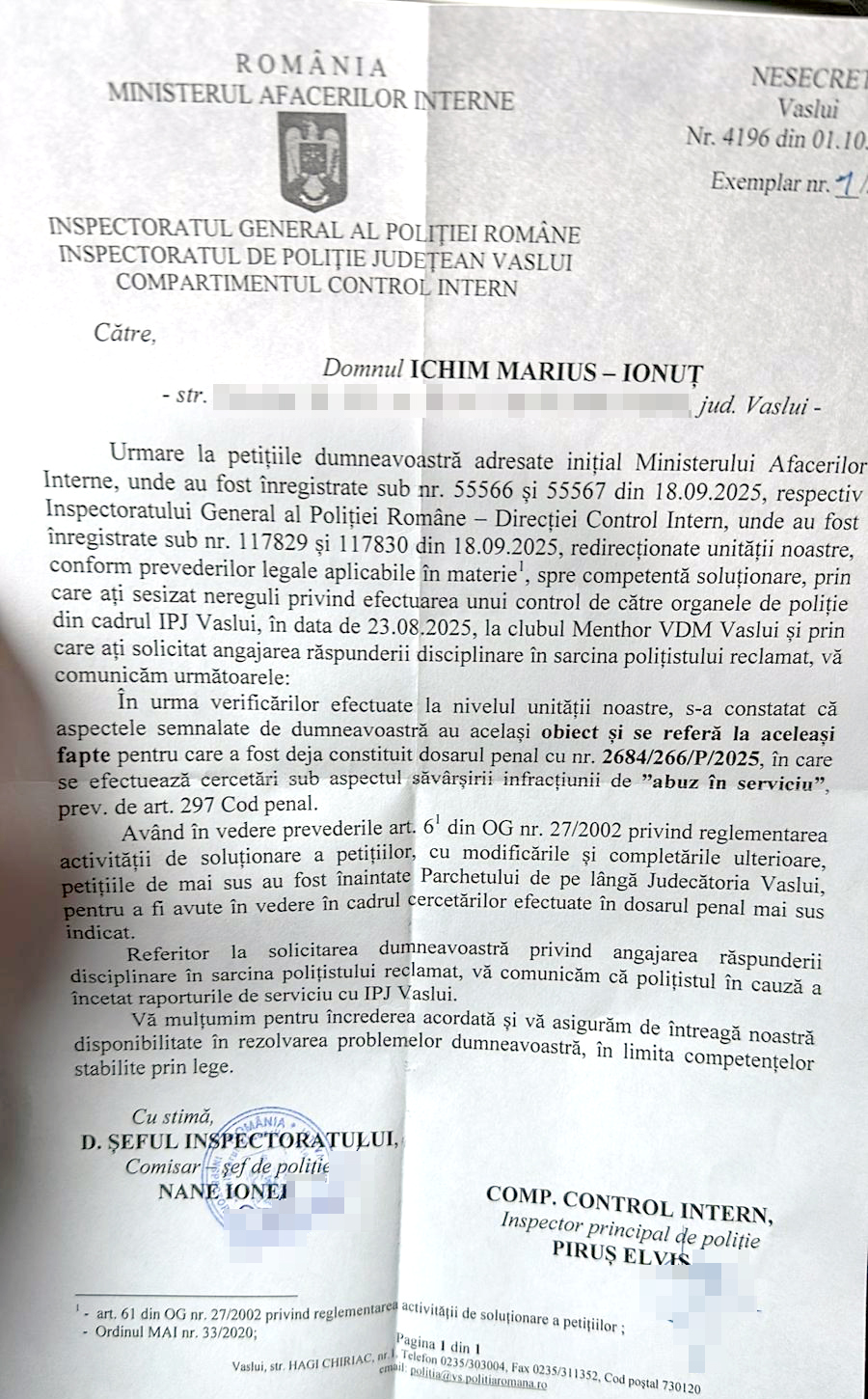 “În urma verificărilor efectuate s-a constatat că aspectele sesizate de dvs au același obiect și se referă la aceleași fapte pentru care deja a fost constituit un dosar penal în care se efectuează cercetări sub aspectul săvârșirii infracțiunii de abuz în serviciu… Referitor la solicitarea dvs privind angajarea răspunderii disciplinare în sarcina polițistului reclamat, vă comunicăm că polițistul în cauză a încetat raporturile de serviciu cu IPJ Vaslui”, se arată în răspunsul primit de către Marius Ichim.