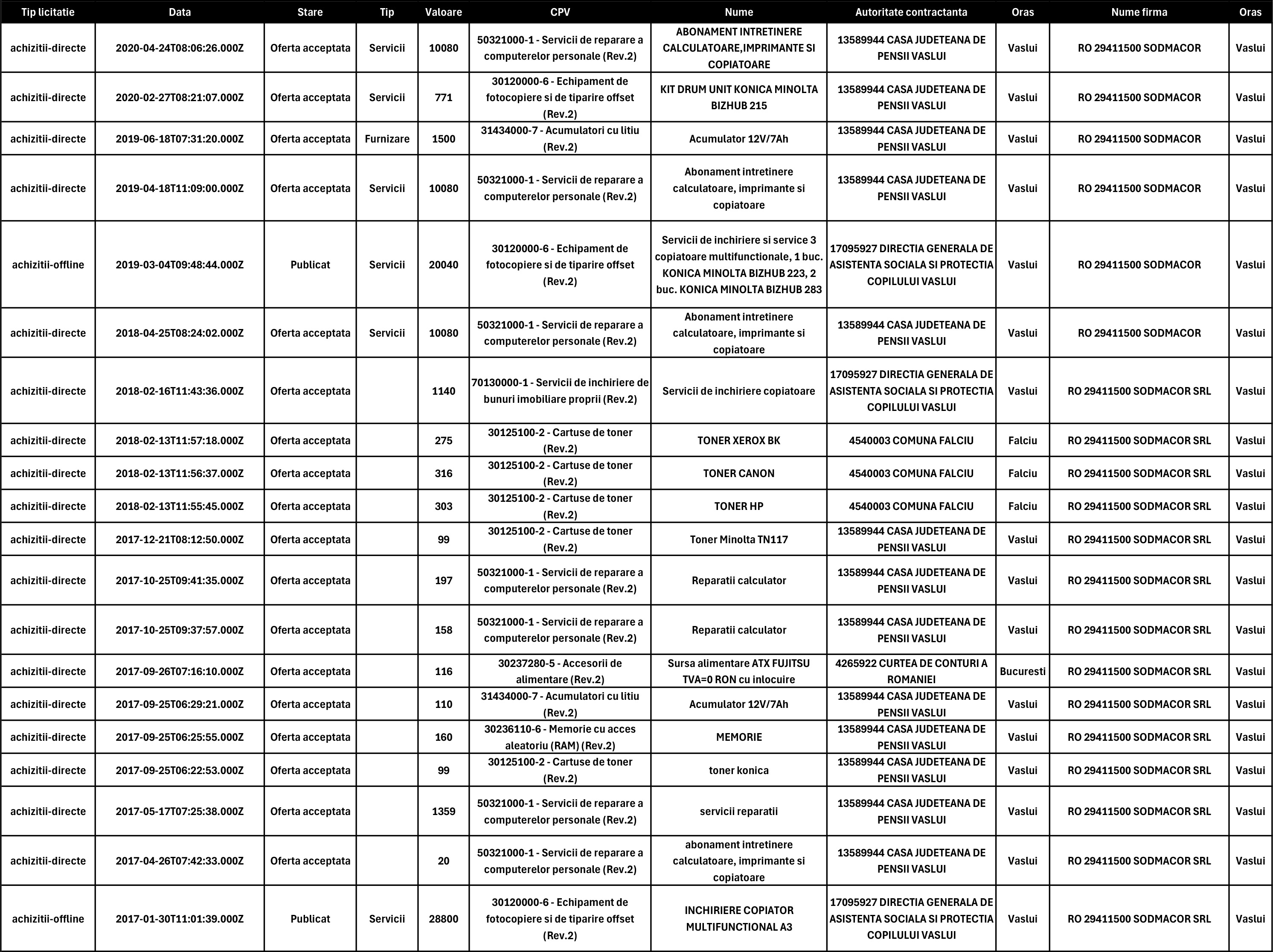 CUM SE FACE?… S-au mai descoperit cazuri de oameni de afaceri în Vaslui care au făcut carieră prin contracte cu statul, dar mai rar care să dețină trei firme și toate să fie abonate la banul public. Casa de Pensii Vaslui, Spitalul Județean, DGASPC, diferite școli din Vaslui, toate acestea apar pe listele cu atribuiri directe de contracte. Faptul că șefii acestor instituții sunt numiți politic sau, în cel mai bun caz, câștigă concursuri dubioase cu un singur candidat, ar putea fi o explicație. Un alt aspect interesant îl constituie continuitatea. Unii ar putea crede că după arestarea lui Dumitru Buzatu s-a terminat cu sistemul în Vaslui, dar, așa cum se poate vedea și la contractele oferite în acest caz precum și în alte cazuri, aceiași oameni sunt preferați pentru achizițiile publice ani la rând, fără nicio sincopă.