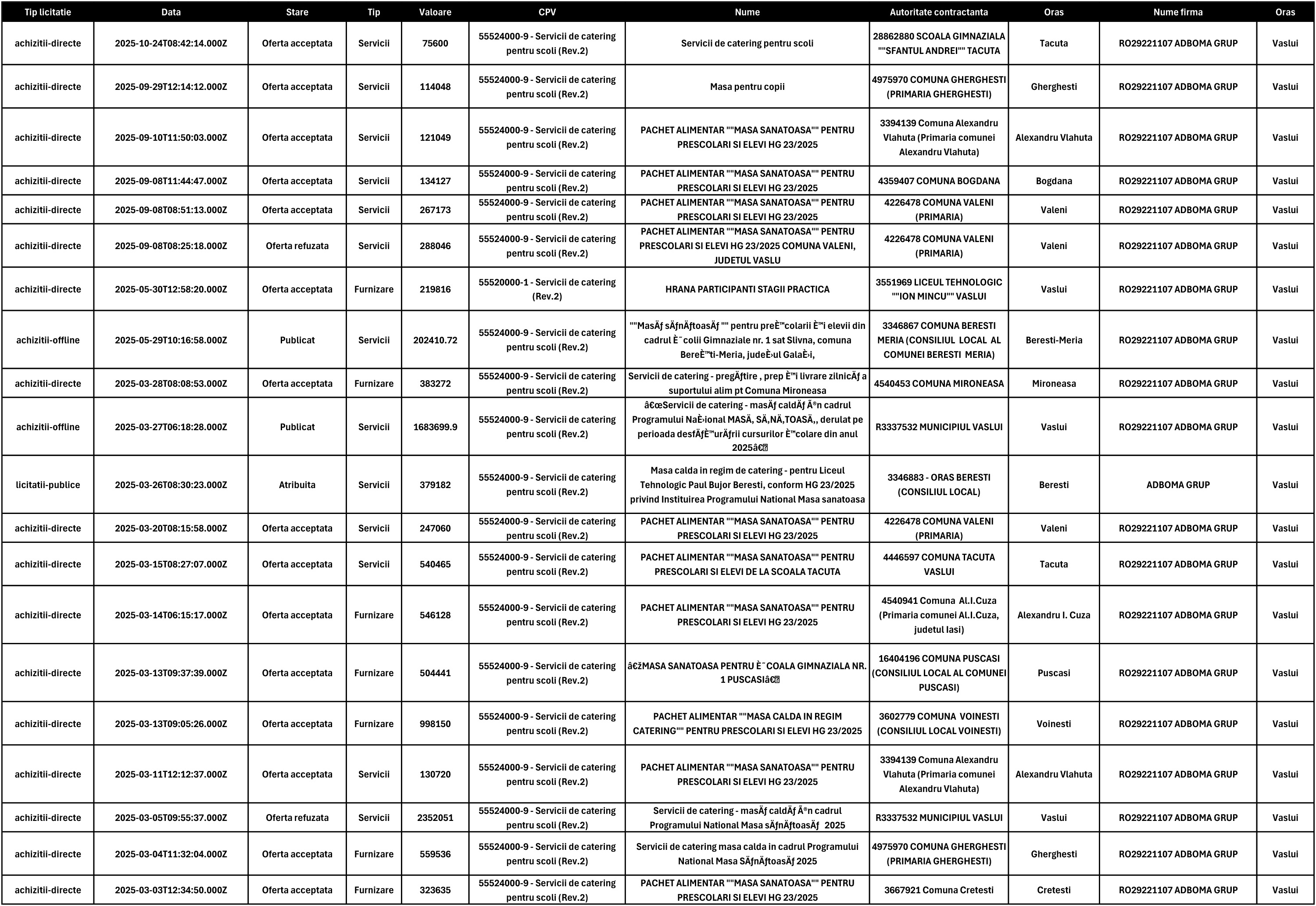 Cea mai importantă piesă a acestui mini-imperiu o reprezintă firma Abdoma grup SRL, firmă care a avut o cifră de afaceri anul trecut, de 11.692.132 RON. Este administrată impecabil de aceeași Elena- Cristina Chiriac, dar la asociați mai apare cu puțin sub 5% Gabriel Chiriac. Domeniul de activitate principal este “fabricarea altor produse alimentare”, cu cap de listă “fabricarea de supe și ciorbe”. Datorită acestor produse, multe comune și școli din județ, dar chiar și de prin vecini, au ales firma pentru asigurarea de hrană elevilor. Oferim câteva exemple de dată recentă: Primăria Văleni, contract de 288.046 RON pentru servicii de catering; Liceul “Ioan Mincu” Vaslui, contract de 219.816 RON pentru servicii catering; Primăria Vaslui, contract de 1.683.699,9 RON pentru servicii de catering – masă sănătoasă în cadrul “Programului Național Masă Sănătoasă”, derulat pe perioada cursurilor școlare. Restul contractelor se pot vedea în tabel.