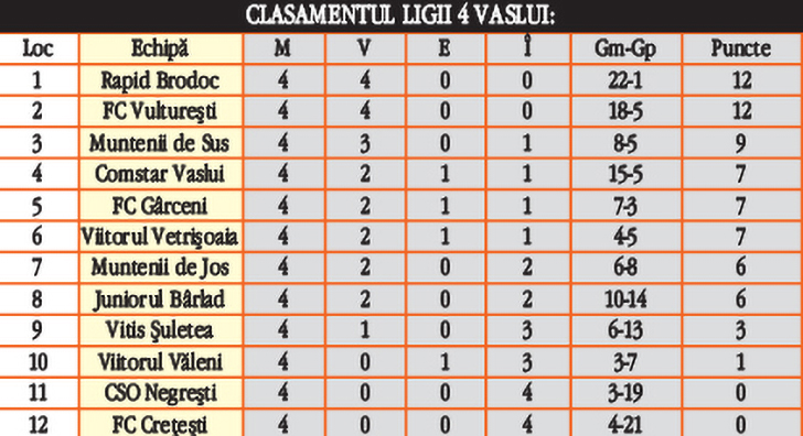 Rapid Brodoc își continuă parcursul fără greșeală în Liga 4, după ce a trecut și de Juniorul Bârlad, scor 4-0. Golurile echipei antrenate de Florin Roiu au fost reușite de Petruț (2), Covăcel și Ponea. Victorie la scor și pentru FC Vulturești, 7-3 cu ultima clasată, FC Crețești. Surprinzător, crețeștenii au condus la pauză cu 3-1, dar gazdele s-au trezit la pauză și au întors scorul. După patru runde, Rapid și Vulturești sunt singurele formații cu maximum de puncte, 12. Meciul familiei Șoldan, tătă versus fiu, s-a încheiat la egalitate, scor 1-1. Pentru Gârceni a marcat Bojoagă, în prima repriză, puștii de la Comstar egalând la ultima fază a meciului, prin Craiu. Meci echilibrat și la Văleni, acolo unde Flacăra Muntenii de Sus s-a impus la limită, 2-1, datorită dublei reușite de Cosovăț. Viitorul Vetrișoaia a obținut prima victorie în deplasare, 1-0 la Muntenii de Jos, iar Vitis Șuletea a spart gheața în partida cu CSO Negrești, 2-1.