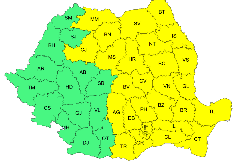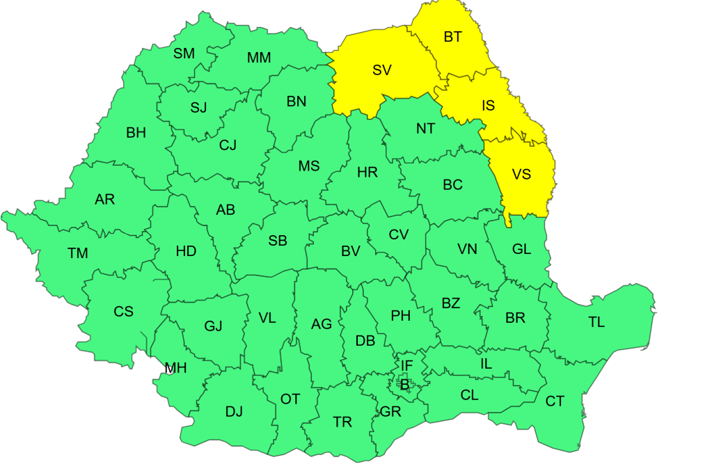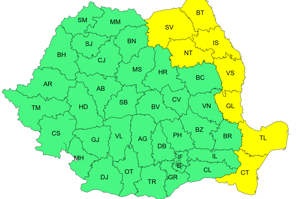 Prima alertă cod galben de ger este valabilă până diseară, la ora 20.00. Vizate sunt nordul și estul Moldovei, unde vor fi temperaturi deosebit de scăzute, local gerul va persista, iar maximele vor fi de -12…-10 grade.