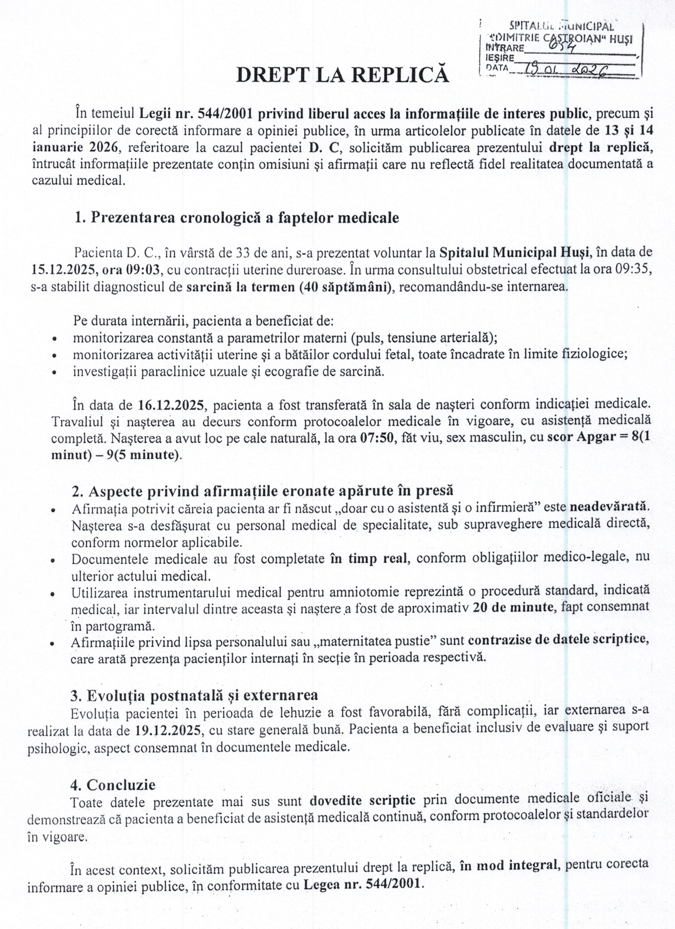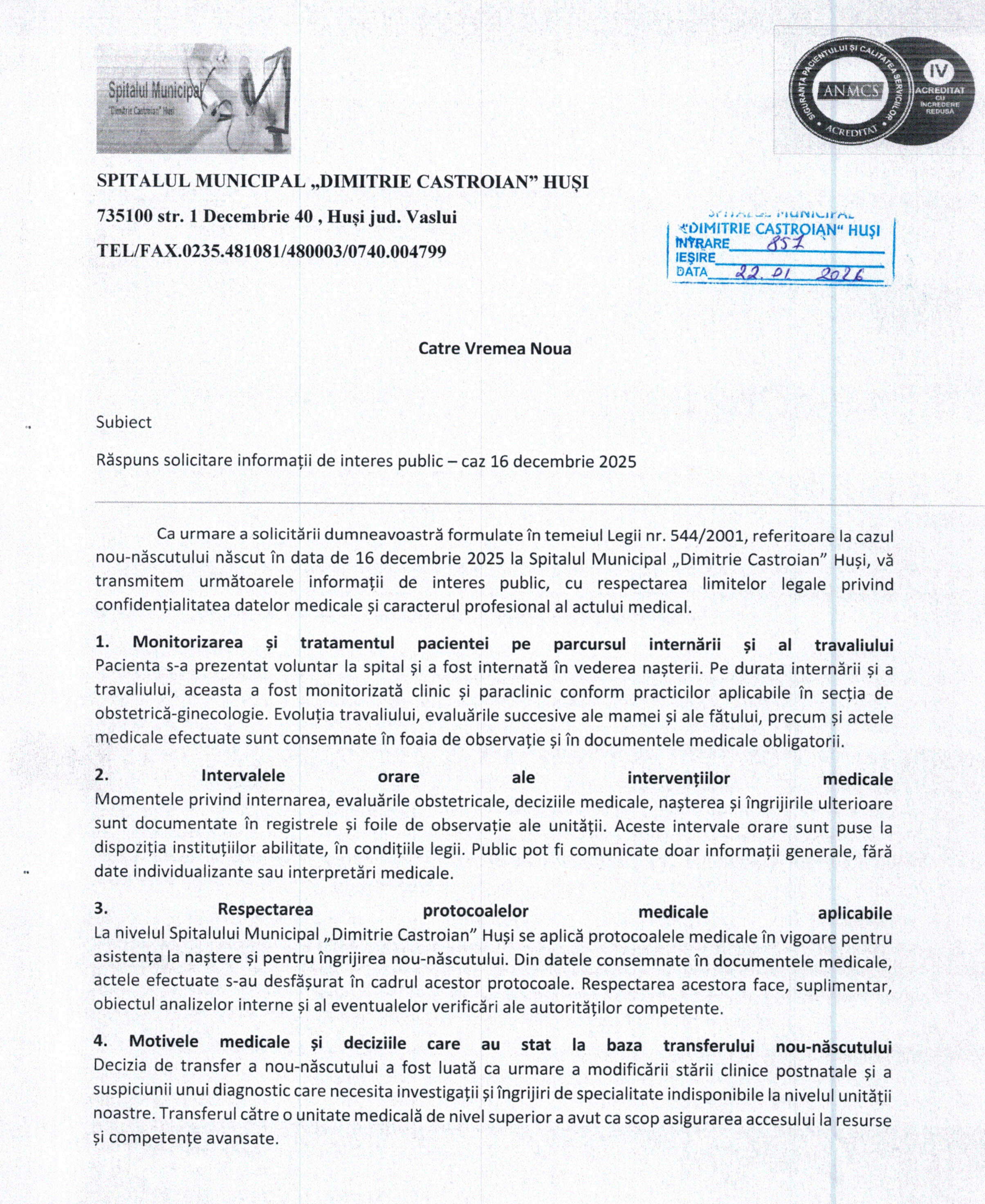 LĂMURIRI… Conducerea Spitalului municipal „Dimitrie Castroian” Huși vine cu clarificări, în cazul tragic al mamei care a născut în unitatea medicală pe 16 decembrie 2025, dar al cărei bebeluș a murit la spitalul Bacău, două zile mai târziu. Cotidianul Vremea Nouă a solicitat spitalului Huși precizări față de acest caz. Cristina Deliu, mama de 33 de ani, a povestit că cele care au ajutat-o să nască au fost o asistentă și o infirmieră, iar o „doamnă doctor venea din când în când, dar doar ca să scrie ceva pe niște foi”, fără să pună mâna pe pacienta care se chinuia să nască. După ce a născut, ca urmare, atenție, a faptului că asistenta a făcut manevra dureroasă a tăierii membranelor, soarta bebelușului de 3.200 de grame și scor Apgar 9 a rămas învăluită în mister, chiar și pentru familia lui. Mama nu a știut, decât că pe la ora 10.00 starea copilului s-a agravat și, după ore întregi de așteptare și neputință, copilul a fost dus seara târziu la spitalul Bacău, unde a și murit. Conducerea spitalului „Dimitrie Castroian” a răspuns solicitării cotidianului Vremea Nouă, de a explica ce s-a petrecut în acest caz. Și, după compararea celor două părți ale poveștii, a mamei și a spitalului, concluzia este clară: mama Cristina Deliu a relatat onest ceea ce a trăit până la momentul nașterii, iar spitalul Huși nu a contrazis-o cu nimic. Femeia a spus de la bun început, că au ajutat-o să nască doar asistenta și infirmiera, iar o doamnă doctor venea din când în când și scria ceva pe niște hârtii, fără să o atingă. De asemenea, femeia a redat întocmai orele de așteptare și neputința cadrelor medicale din spitalul Huși de a transfera bebelușul mai repede la un spital, unde să primească tratamentul salvator. Nici aici spitalul Huși nu a putut să o contrazică. Ba, declarația medicului neonatolog, pe care o vom reda în cuprinsul materialului, arată adevărul și mai dureros: spitalul Huși, chiar dacă a cerut transferul nou-născutului la o unitate competentă, pentru că viața micuțului atârna de fiecare secundă și la Huși nu aveau ce să îi facă, ore în șir neputința de a-l transfera la un alt spital a fost decisivă. „Transferul nou născutului s-a efectuat pe baza ierarhizării unităților sanitare neonatale, în baza competențelor”, arată medicul neonatolog. De la ora 11.00 s-a încercat transferarea copilului la un spital care avea capacitatea să îl salveze, însă abia după aproape 9 ore, un echipaj de la Iași a venit să îl ducă la Bacău. Pentru bebelușul Cristinei Deliu însă era mult prea târziu.