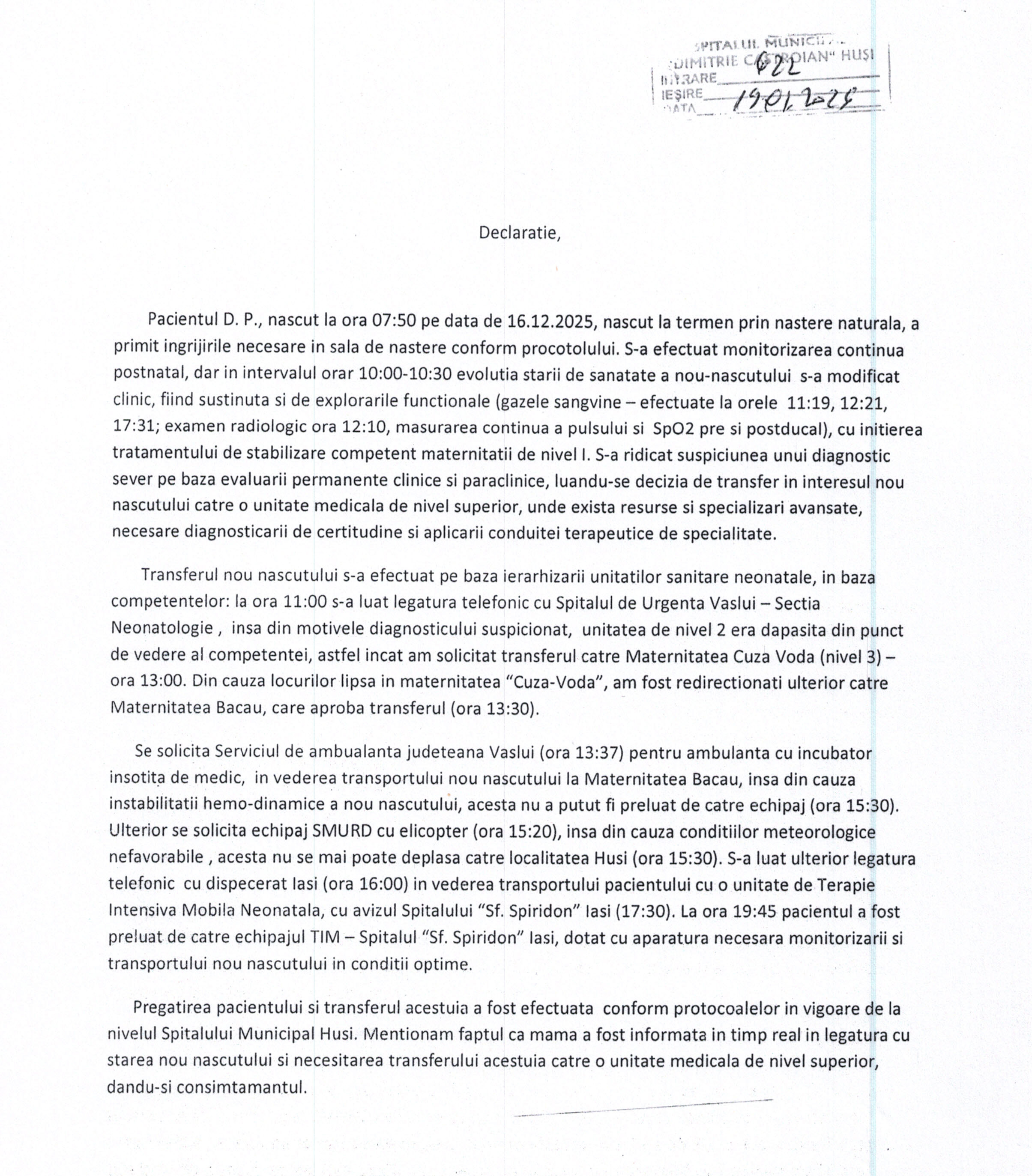 Iată ce a declarat, integral, medicul neonatolog implicat în acest caz, despre băiețelul născut în dimineața zilei de 16 decembrie 2025, la spitalul Huși. „Pacientul D. P., născut la ora 07:50 pe data de 16.12.2025, născut la termen prin naștere naturală, a primit îngrijirile necesare în sala de naștere conform protocolului. S-a efectuat monitorizarea continuă postnatal, dar în intervalul orar 10:00-10:30 evoluția stării de sănătate a nou-născutului s-a modificat clinic, fiind susținută și de explorările funcționale (gazele sangvine – efectuate la orele 11:19, 12:21, 17:31; examen radiologic ora 12:10, măsurarea continuă a pulsului și SpO2 pre și postducal), cu inițierea tratamentului de stabilizare competent maternității de nivel I. S-a ridicat suspiciunea unui diagnostic sever pe baza evaluării permanente clinice și paraclinice, luându-se decizia de transfer în interesul nou născutului către o unitate medicală de nivel superior, unde există resurse și specializări avansate, necesare diagnosticării de certitudine și aplicării conduitei terapeutice de specialitate. Transferul nou născutului s-a efectuat pe baza ierarhizării unităților sanitare neonatale, în baza competențelor: la ora 11:00 s-a luat legătura telefonic cu Spitalul de Urgență Vaslui – Secția Neonatologie, însă din motivele diagnosticului suspicionat, unitatea de nivel 2 era depășită din punct de vedere al competenței, astfel încât am solicitat transferul către Maternitatea Cuza Vodă (nivel 3) – ora 13:00. Din cauza locurilor lipsă în maternitatea “Cuza-Vodă”, am fost redirecționați ulterior către Maternitatea Bacău, care aproba transferul (ora 13:30). Se solicită Serviciul de Ambulanță județeană Vaslui (ora 13:37) pentru ambulanța cu incubator însoțită de medic, în vederea transportului nou născutului la Maternitatea Bacău, însă din cauza instabilității hemo-dinamice a nou născutului, acesta nu a putut fi preluat de către echipaj (ora 15:30). Ulterior se solicită echipaj SMURD cu elicopter (ora 15:20), însă din cauza condițiilor meteorologice nefavorabile, acesta nu se mai poate deplasa către localitatea Huși (ora 15:30). S-a luat ulterior legătura telefonic cu dispecerat lași (ora 16:00) în vederea transportului pacientului cu o unitate de Terapie Intensivă Mobilă Neonatală, cu avizul Spitalului “Sf. Spiridon” lași (17:30). La ora 19:45 pacientul a fost preluat de către echipajul TIM – Spitalul “Sf. Spiridon” lași, dotat cu aparatura necesară monitorizării și transportului nou născutului în condiții optime. Pregătirea pacientului și transferul acestuia a fost efectuată conform protocoalelor în vigoare de la nivelul Spitalului Municipal Huși. Menționam faptul că mama a fost informată în timp real în legătură cu starea nou născutului și necesitarea transferului acestuia către o unitate medicală de nivel superior, dându-si consimțământul”, este declarația medicului neonatolog care s-a îngrijit de fiul Cristinei Deliu.