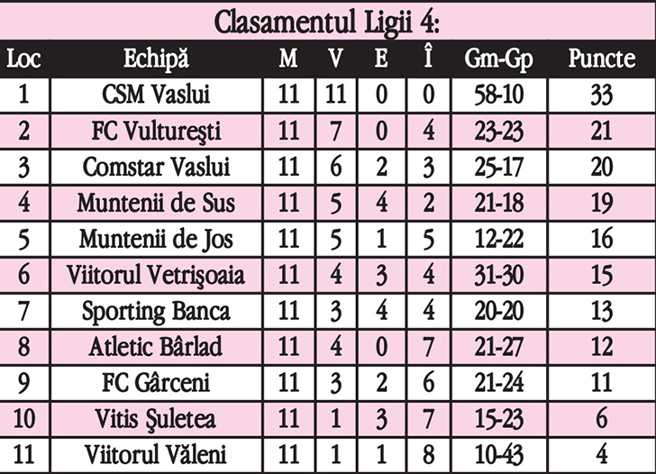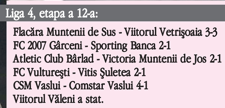 CSM Vaslui a pornit perfect în campania de calificare la barajul de promovare în Liga 3. Trupa pregătită de Gabriel Crăciun s-a impus fără prea mari emoții în derby-ul cu SC Comstar Vaslui, scor 4-1, datorită golurilor marcate de Vasile Buhăescu, Sebastian Țârțârău, Ionuț Jitaru și Sergiu Gîrdea. Pentru oaspeți punctat Gabi Craiu. În clasament, CSM Vaslui se află pe primul loc, cu 11 victorii din tot atâtea posibile, având un avans de 12 puncte față de ocupanta locului secund. Meci cu goluri multe și la Muntenii de Sus, acolo unde Flacăra a terminat la egalitate cu Viitorul Vetrișoaia, scor 3-3. “Muntenarii” au condus cu 3-1, după golurile reușite de Cosovăț, Suciu și Bușilă, dar Vetrișoaia a revenit și a smuls un punct important, care o menține cu șanse în lupta pentru calificarea în play-off. FC Vulturești a întors rezultatul meciului cu Vitis Șuletea (2-1) și a urcat pe locul doi în clasament. Răsturnare de rezultat și la meciul dintre Atletic Bârlad și Victoria Muntenii de Jos. Oaspeții au condus cu 1-0 la pauză, dar puștii lui Nicu Patrichi au întors scorul și au obținut cea de-a patra victorie din acest sezon. Într-un alt joc, FC 2007 Gârceni a învins Sporting Banca, scor 2-1, și Gârceniul speră la salvarea directă de la retrogradare.