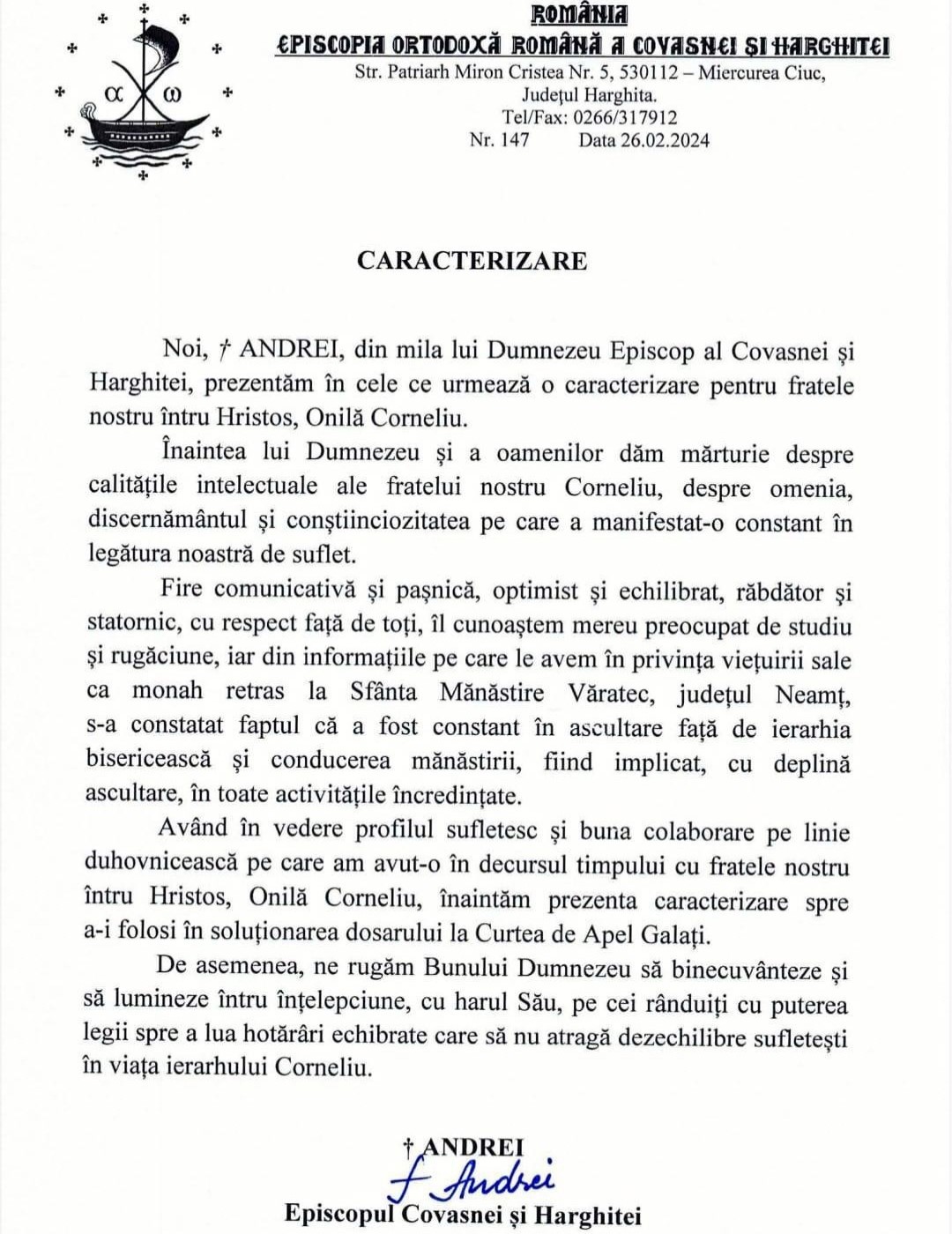 Iată, acestea sunt caracterizările depuse la dosar, pe care cei trei ierarhi i le-au făcut lui Onilă, în care susțin că l-ar vrea înapoi în funcția de Episcop al Hușilor: