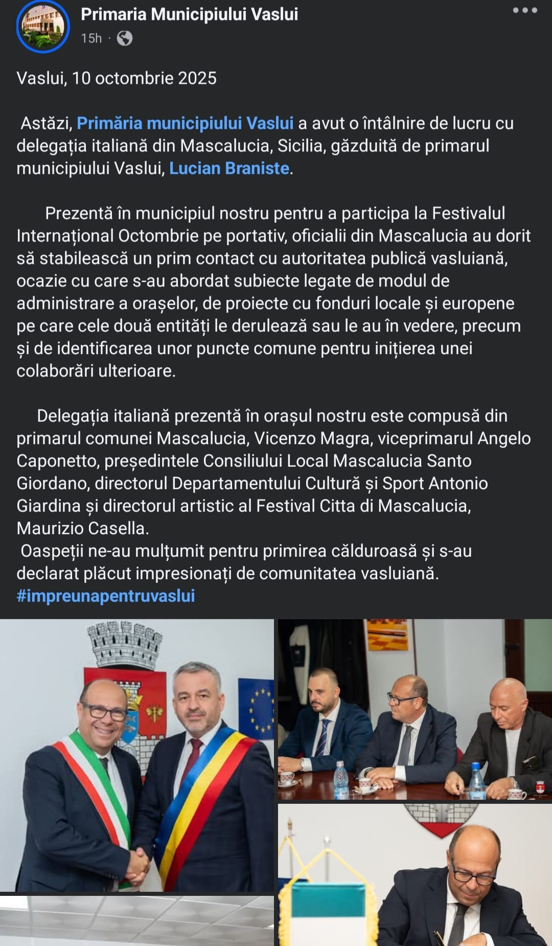 GAZDĂ BUNĂ… Primarul Braniște și-a lărgit deja cercul influent la nivel internațional. Conform acestuia, vineri a avut loc la Vaslui o întâlnire importantă cu o delegație condusă de primarul din Mascalucia, Vicenzo Magra, întâlnire despre care a relatat cu seriozitate chiar primarul Braniște pe pagina sa oficială de Facebook. “Primăria municipiului Vaslui a avut o întâlnire de lucru cu delegația italiană din Mascalucia, Sicilia, găzduită de primarul municipiului Vaslui, Lucian Braniste. Prezentă în municipiul nostru pentru a participa la Festivalul Internațional „Octombrie pe portativ”, oficialii din Mascalucia au dorit să stabilească un prim contact cu autoritatea publică vasluiană, ocazie cu care s-au abordat subiecte legate de modul de administrare a orașelor, de proiecte cu fonduri locale și europene pe care cele două entități le derulează sau le au în vedere, precum și de identificarea unor puncte comune pentru inițierea unei colaborări ulterioare. Delegația italiană prezentă în orașul nostru este compusă din primarul comunei Mascalucia, Vicenzo Magra, viceprimarul Angelo Caponetto, președintele Consiliului Local Mascalucia Santo Giordano, directorul Departamentului Cultură și Sport Antonio Giardina și directorul artistic al Festival Citta di Mascalucia, Maurizio Casella. Oaspeții ne-au mulțumit pentru primirea călduroasă și s-au declarat plăcut impresionați de comunitatea vasluiană.”