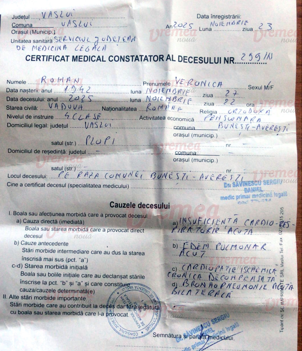 Moartea femeii de 82 de ani, găsită moartă în locul izolat din satul Plopi, numit „Găzărie”, a survenit ca urmare a unui infarct, după cum a fost scris negru pe alb în certificatul de deces. De aici, localnicii au început să își pună multe întrebări, pentru a înțelege ce s-a petrecut de fapt. Este foarte important, spun ei, clarificarea acestui deces, pentru ca oamenii locului să nu stea cu frică în micul cătun din comuna Bunești- Averești. Și iată că reprezentanții medicinei Legale Vaslui fac o precizare extrem de importantă în acest caz, prin vocea șefului instituției, medicul Alexandru Bazatin. Acesta a declarat pentru Vremea Nouă faptul că, indubitabil, din toate datele științifice rezultate în urma necropsiei, decesul femeii din satul Plopi a survenit în urma unui infarct, care, atenție, s-a produs înainte ca animalele să muște din trupul bătrânei. Pe această constatare de netăgăduit a specialiștilor de la Medicina Legală Vaslui, se conturează faptul că femeia în cauză a suferit infarctul pe drum și a căzut în zona în care a și fost găsită. Probabil, cadavrul a atras animalele din zonă, care însă ar trebui să fie stabilit dacă au fost câini, așa cum bănuie sătenii, sau o haită de șacali. Specialiști care cunosc modul în care se comportă șacalii spun că este puțin probabil să fie vorba despre câini, întrucât „câinii nu mănâncă oameni, dar șacalii, da”, spune directorul DSVSA, doctorul Mihai Ponea.