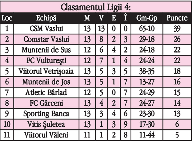 LA SCOR… Etapa a 14-a din Liga a 4-a Vaslui a adus puncte pentru ocupantele locurilor fruntașe. Favoritele n-au avut emoții și și-au consolidat pozițiile din clasament. CSM Vaslui, Comstar Vaslui, Flacăra Muntenii de Sus și FC Vulturești sunt cu un picior în play-off-ul competiției.