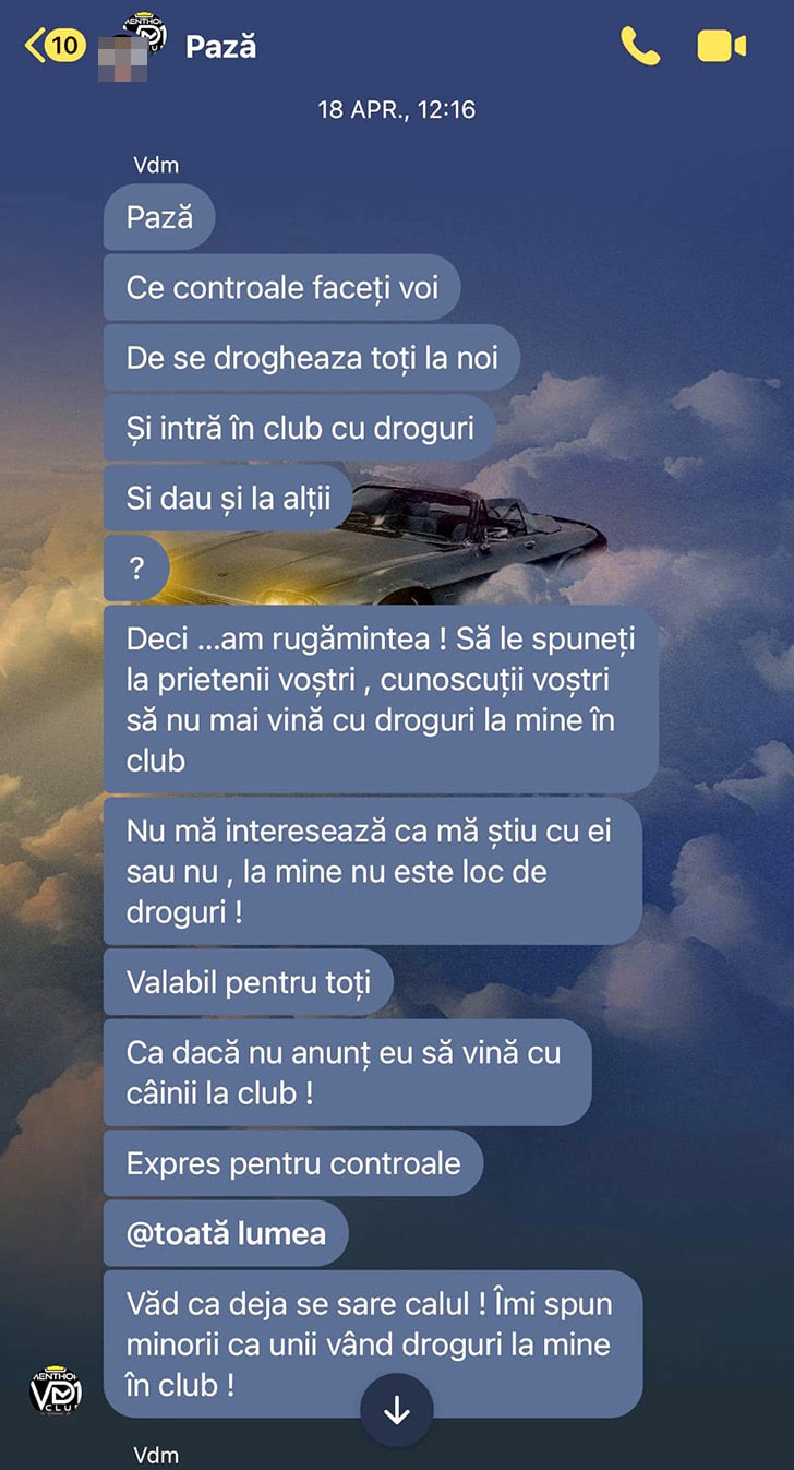 Supriza a venit ieri când, pe adresa redacției am primit o fotografie cu un mesaj de pe un telefon mobil, care se pare că aparțin celor de la Pază, dacă e să ne luăm după ce apare pe imagine. În acel mesaj patronul Clubului Menthor își certa “forțele de ordine” pentru că, în clubul lui, se consumă droguri și chiar a amenințat că, dacă lucrul acesta va continua, el va fi cel care va cere autorităților controale cu câini specializați. “Pază! Ce controale faceți voi de se droghează toți la noi și intră și cu droguri în club? Și dau și la alții? Deci… am rugămintea să le spuneți la prietenii voștri, cunoscuții voștri, să nu mai vină cu droguri în club. Valabil pentru toți. Că de nu, eu anunț să vină cu câinii în club, expres pentru controale. Văd că deja se sare calul! Îmi spun minorii că unii vând droguri la mine în club”, a spus, în mesaj, patronul Clubului Menthor. Se pare că această problemă este una veche ținând cont de faptul că mesajul datează din luna aprilie a acestui an.